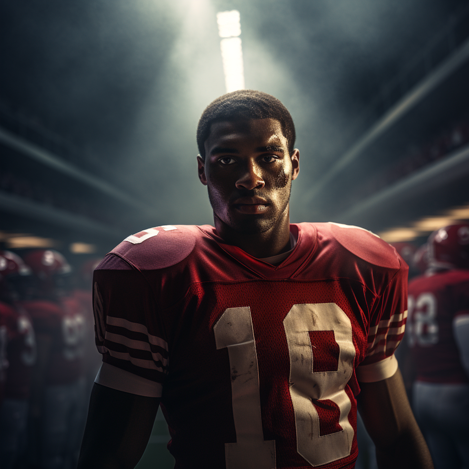 Focused football player in red jersey number 18 stands in a dimly lit stadium, exuding determination and readiness for the game.