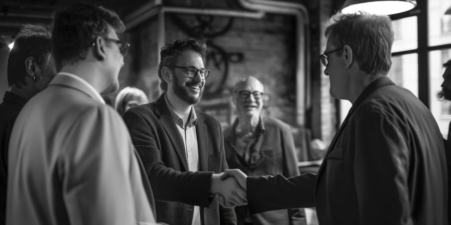 Men in a professional setting shaking hands, smiling, and engaging in conversation in a warmly lit room with an industrial feel.