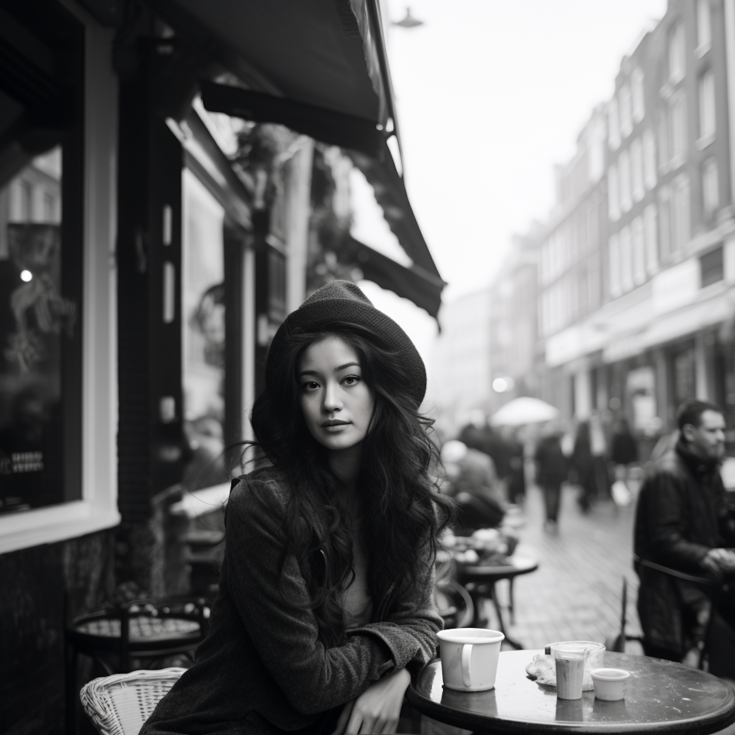 Black and white photo of a young Asian woman at a café, with a bustling street in the background.