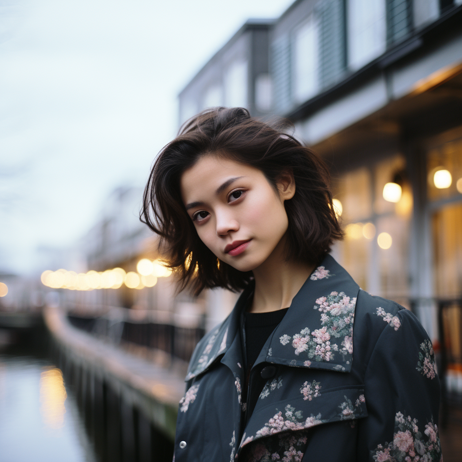 Young Asian woman in floral coat by a canal, with warm lights and serene atmosphere. Short dark hair, calm expression, blurred background.