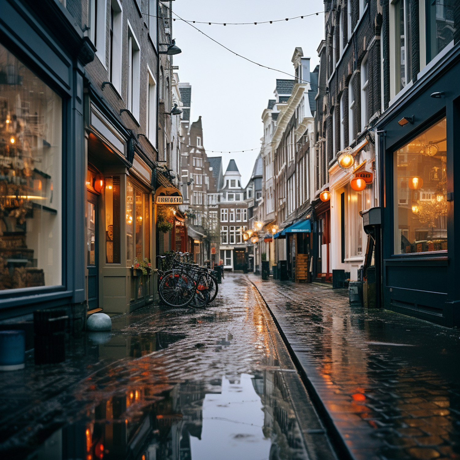 Charming European street with cobblestones, glowing shop windows, and parked bicycles, reflecting a cozy, rainy ambiance.
