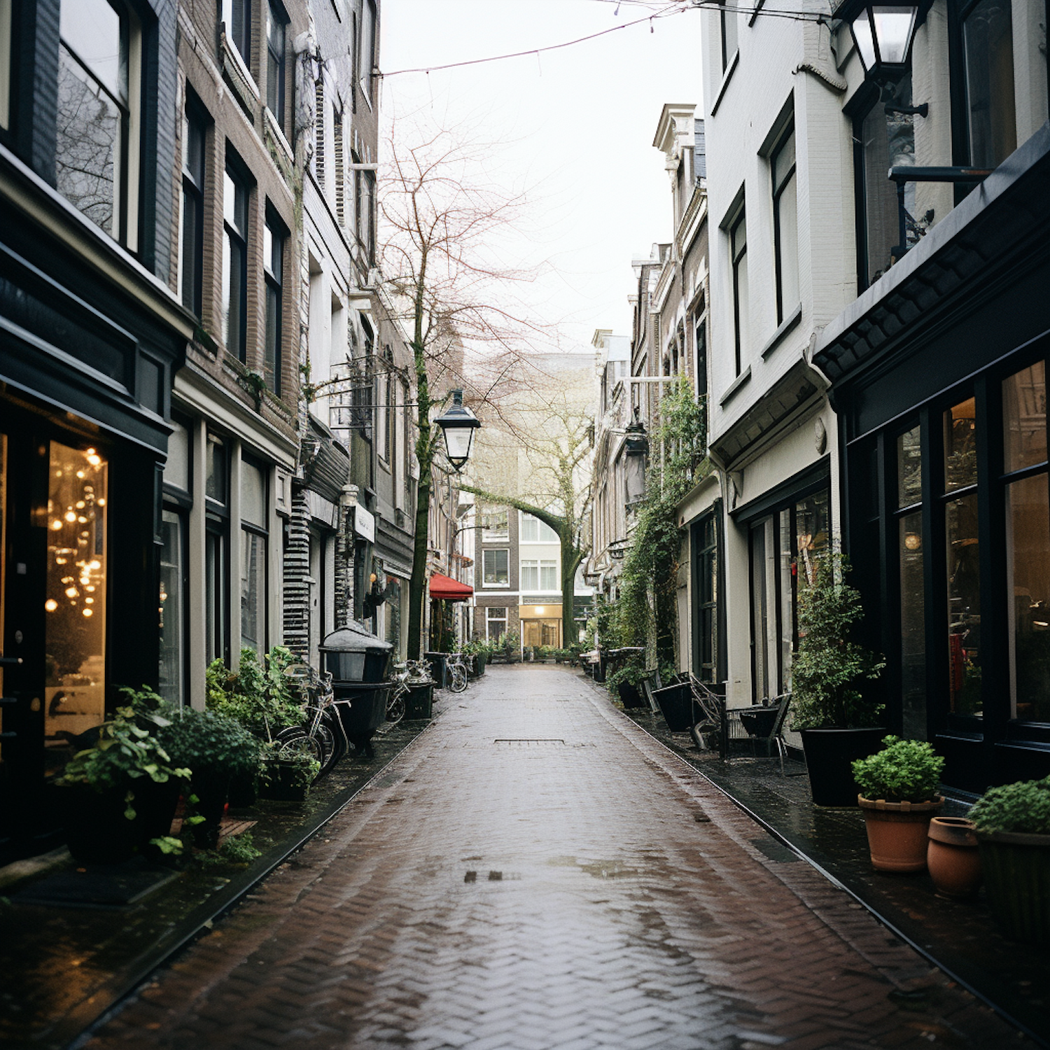 Charming cobblestone street with historic buildings, potted plants, bicycles, and a red awning, reflecting a cozy, rainy atmosphere.
