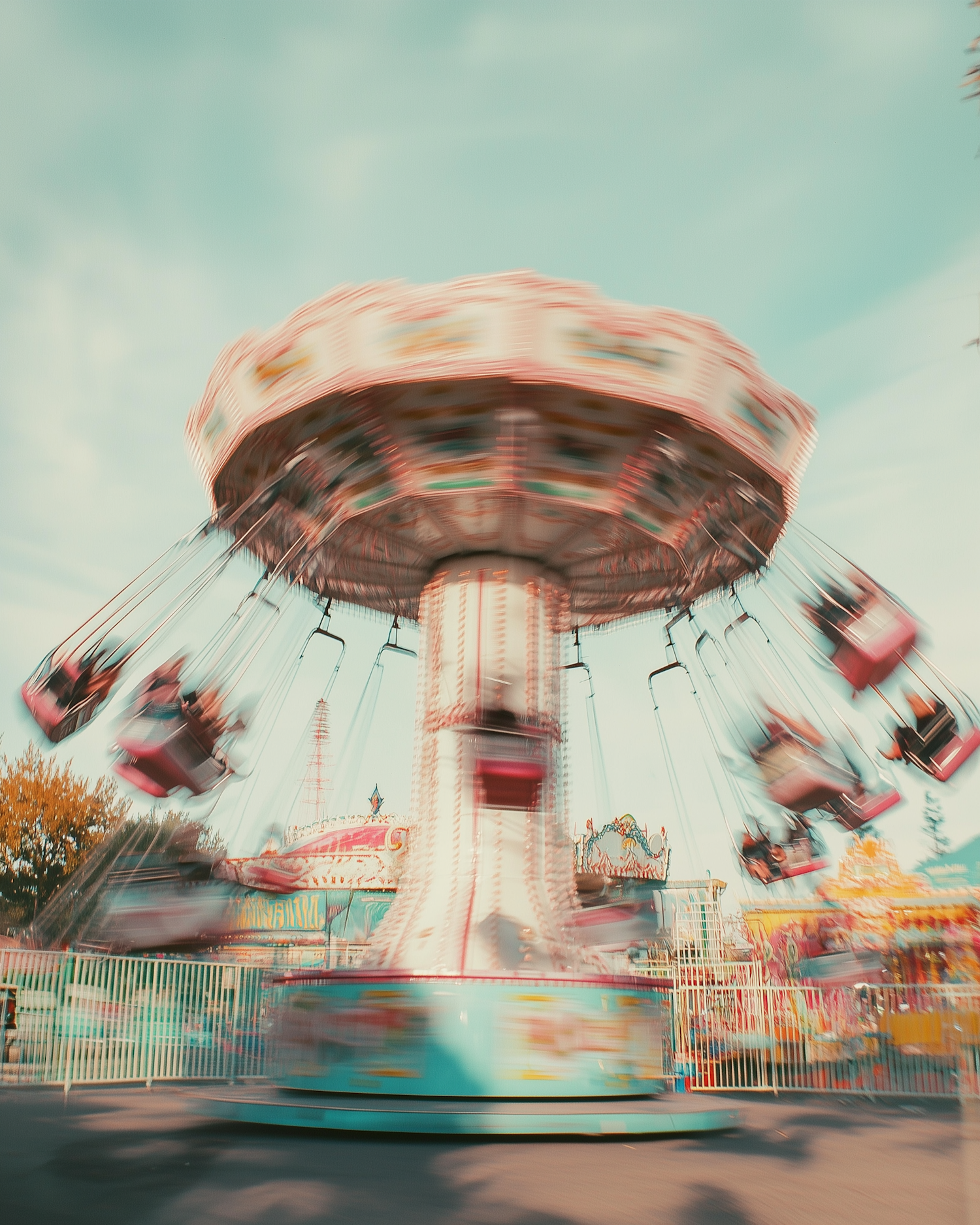A spinning swing carousel in motion at an amusement park, with colorful decor and blurred riders, set against a bright blue sky.