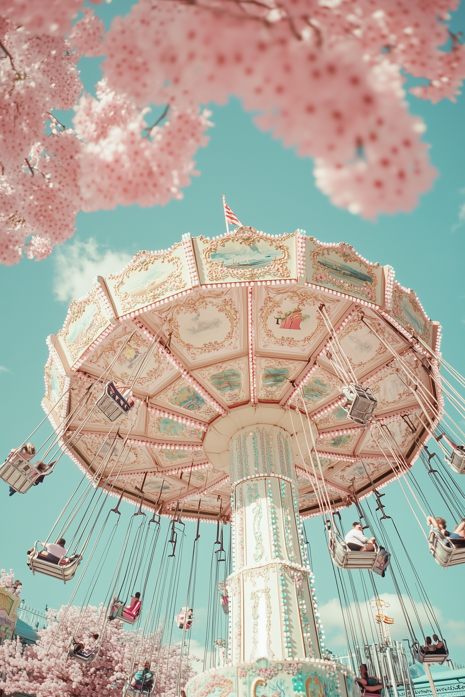 Vintage swing carousel with pastel designs and cherry blossoms under a blue sky, evoking a dreamy, nostalgic amusement park vibe.