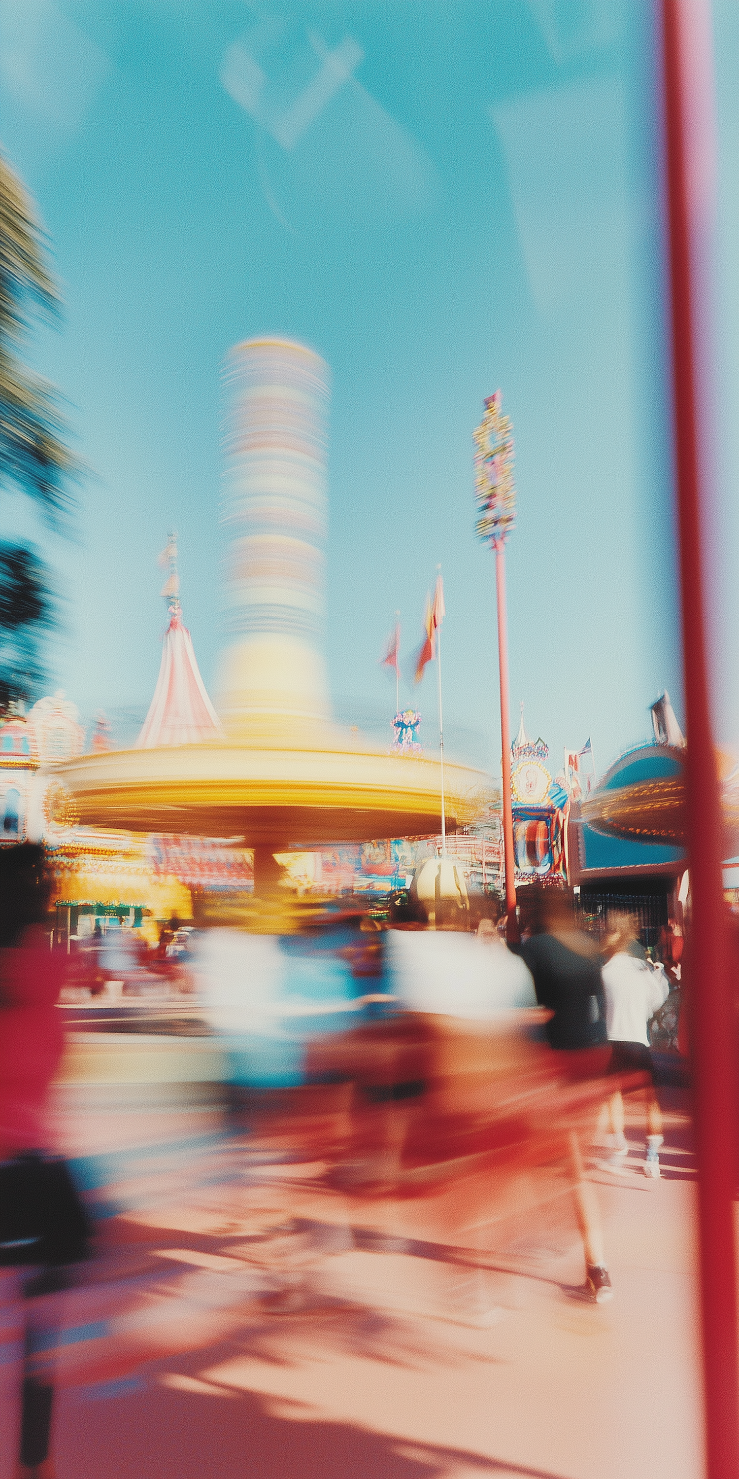 Blurred motion of a colorful carousel at an amusement park, with vibrant flags and people creating a lively atmosphere.