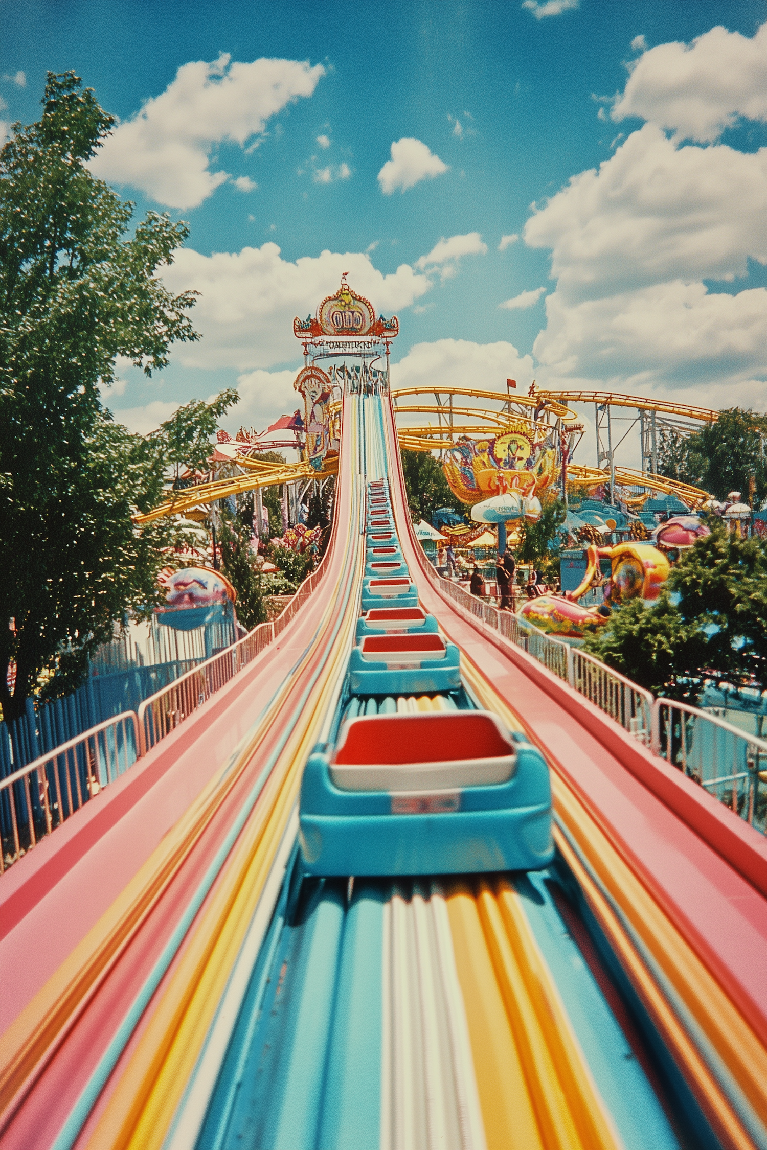 Experience the thrill of a colorful amusement park slide with vibrant hues and a nostalgic touch under a bright blue sky.