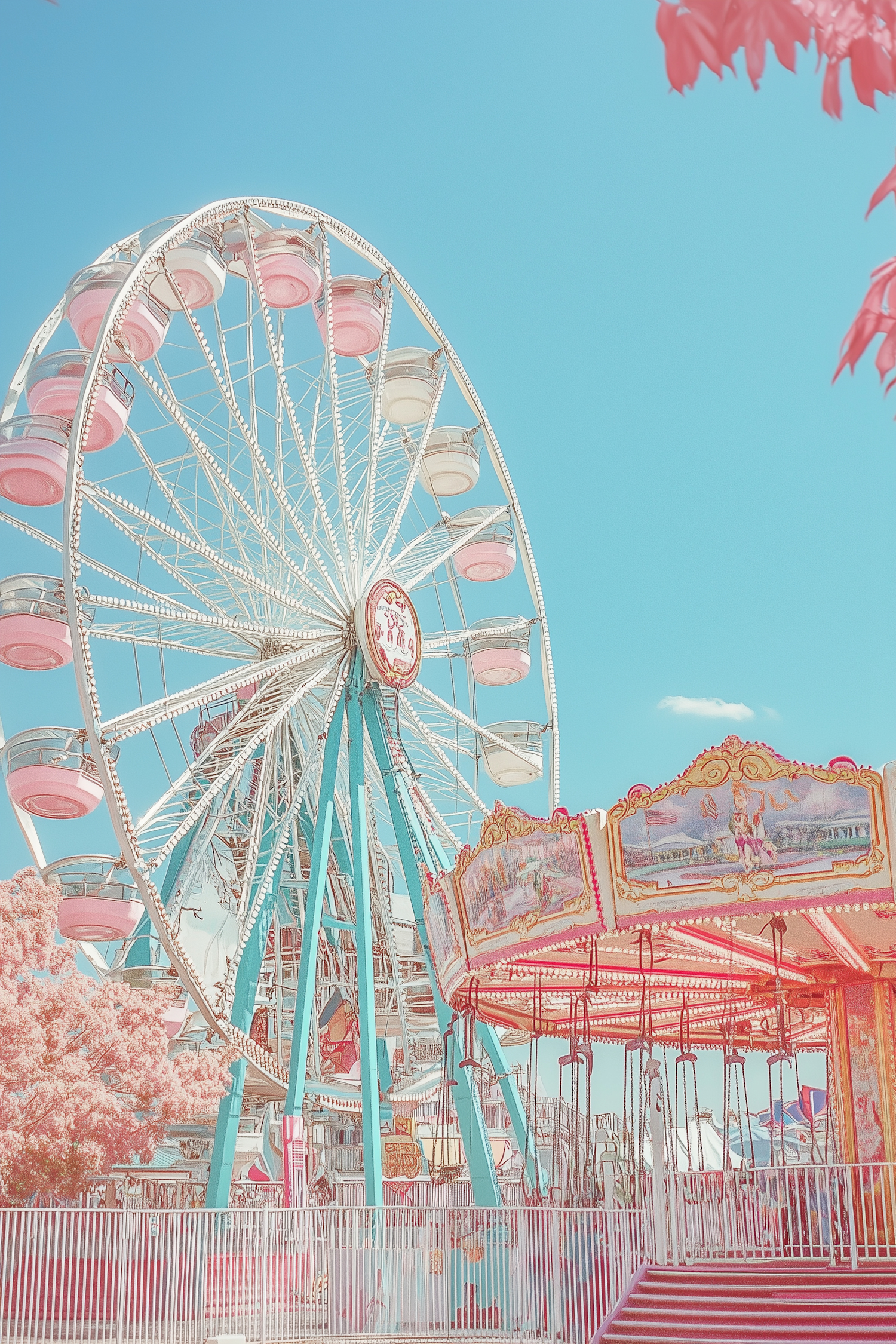 Whimsical amusement park scene with a pastel Ferris wheel and vintage carousel under a clear blue sky.