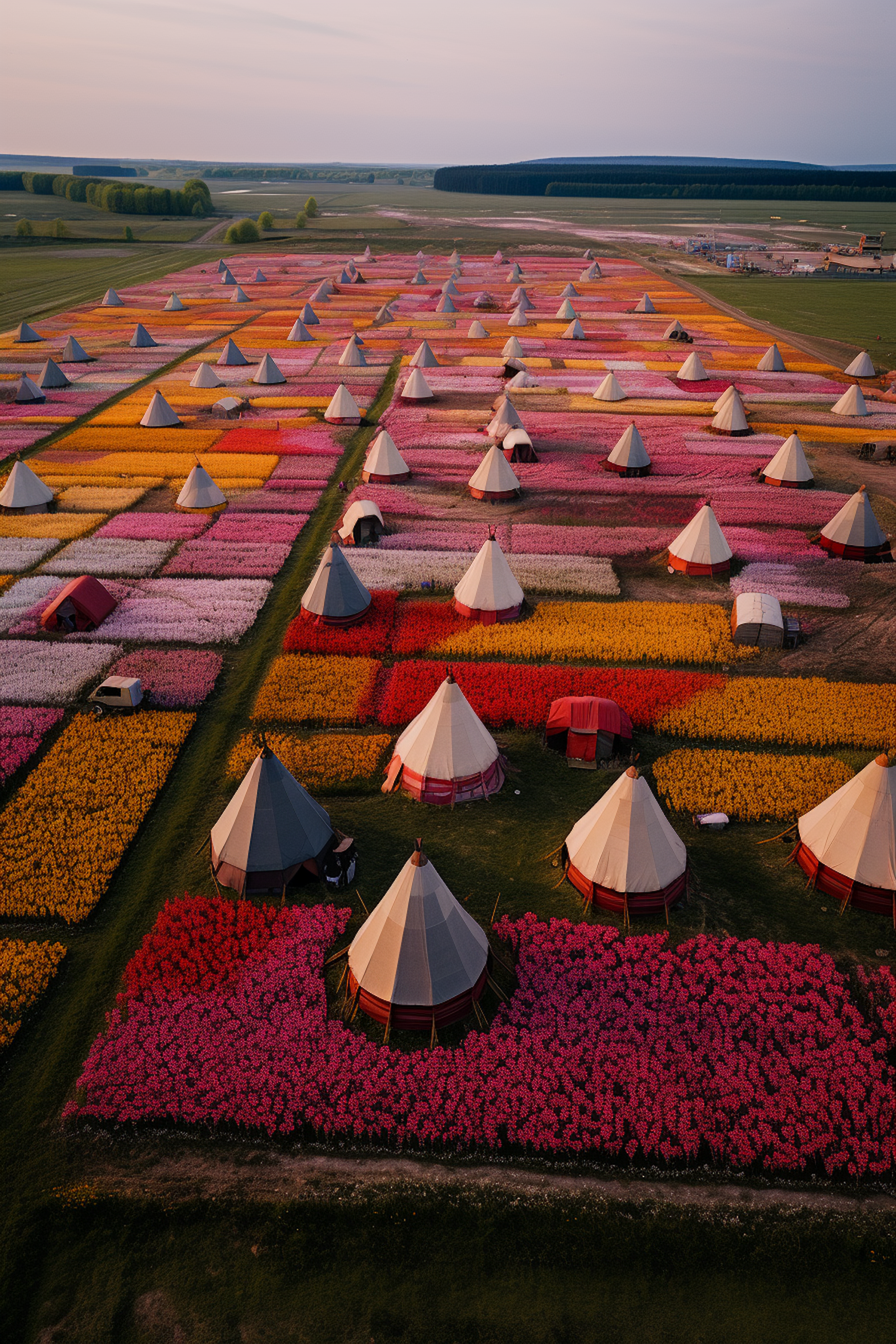 Aerial view of colorful tents and flower fields creating a vibrant patchwork landscape under a warm sunset glow.