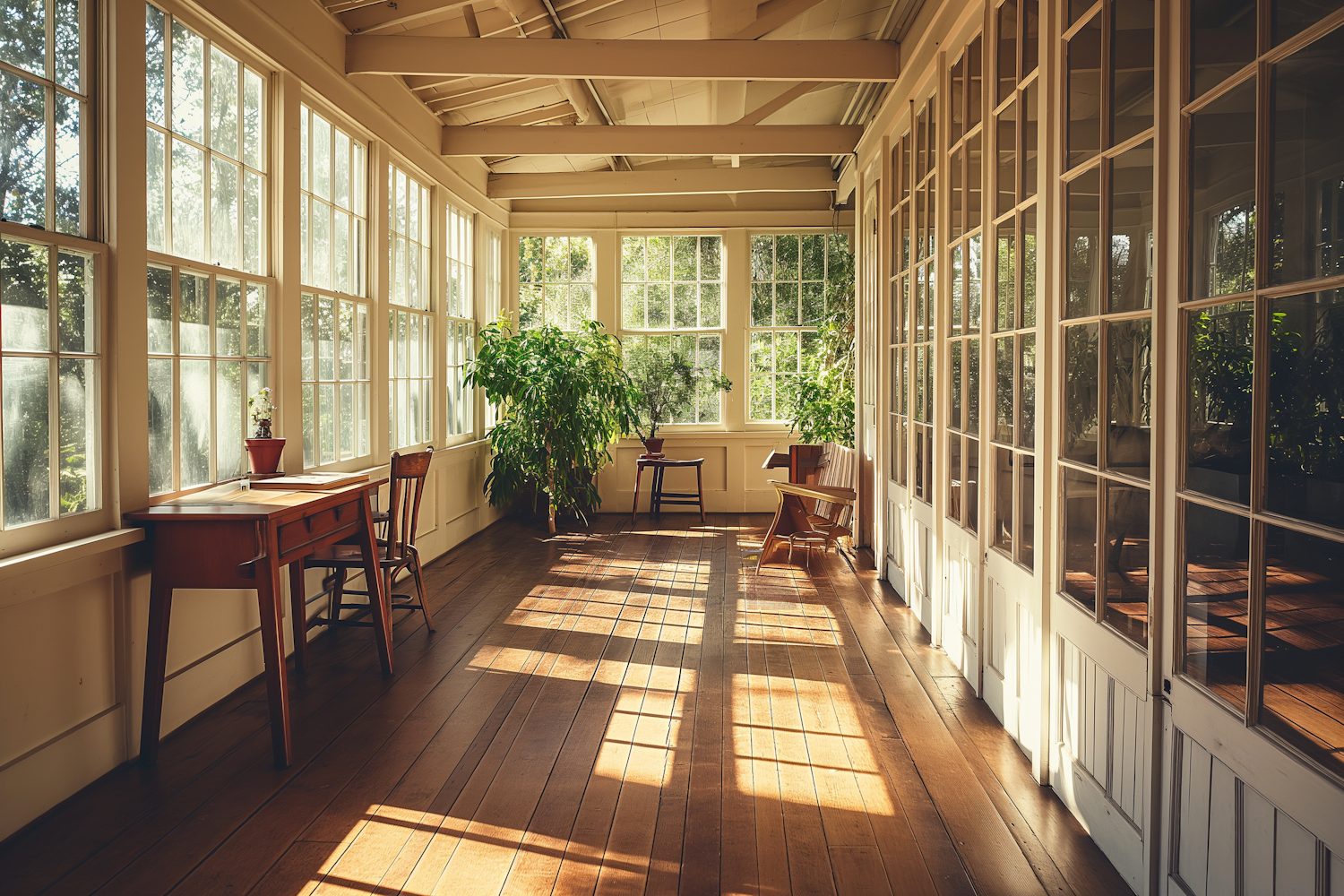 Sunlit room with large windows, wooden furniture, and lush plants. Warm, inviting atmosphere with natural light and soft shadows.