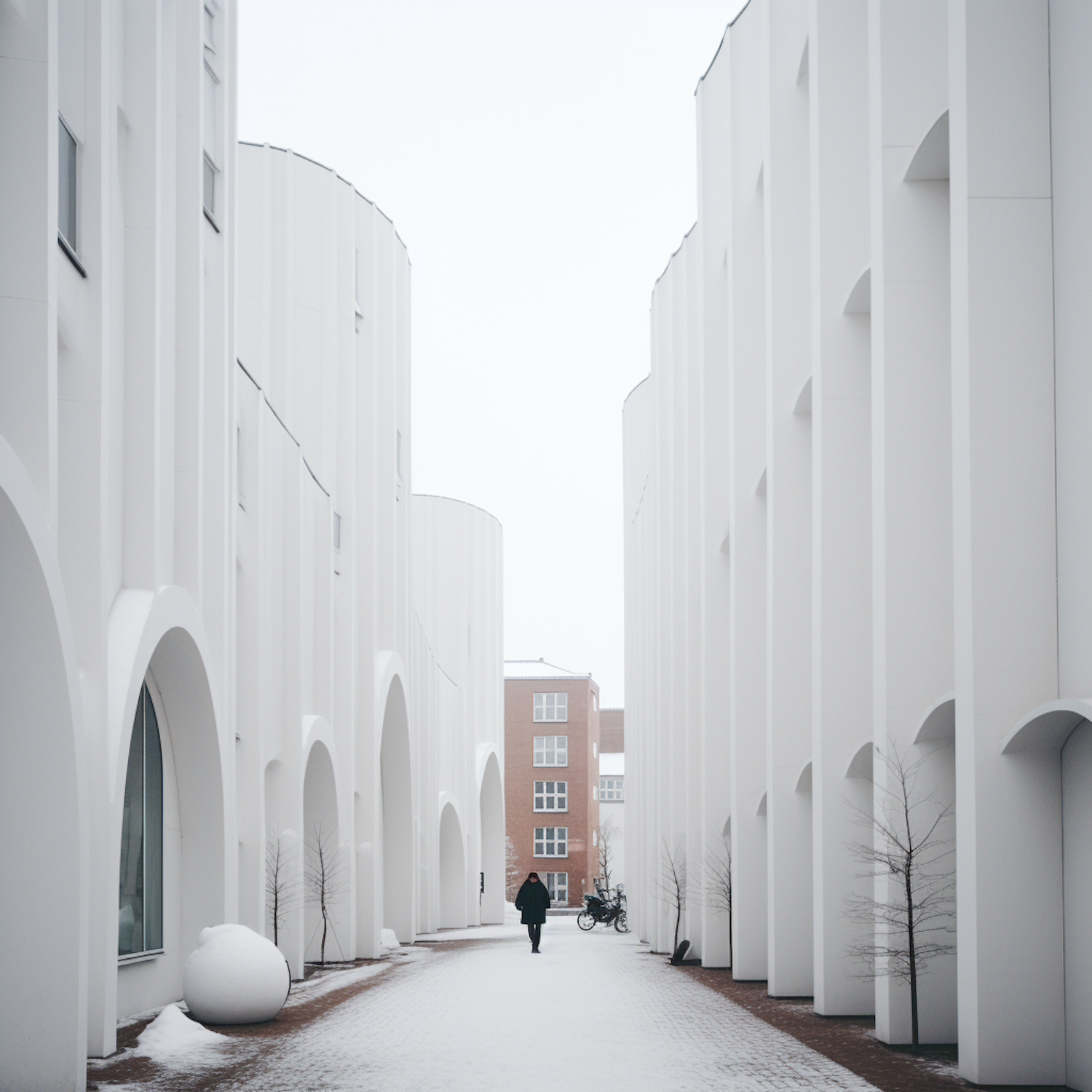 A person walks between modern white buildings with arched windows, snow-covered path, and a contrasting red brick building in the background.