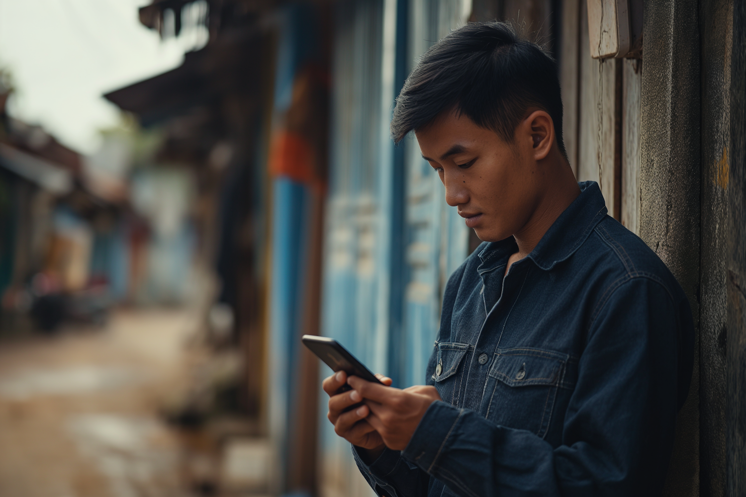 Asian man in denim jacket focused on smartphone in urban street setting, soft lighting, contemplative mood.