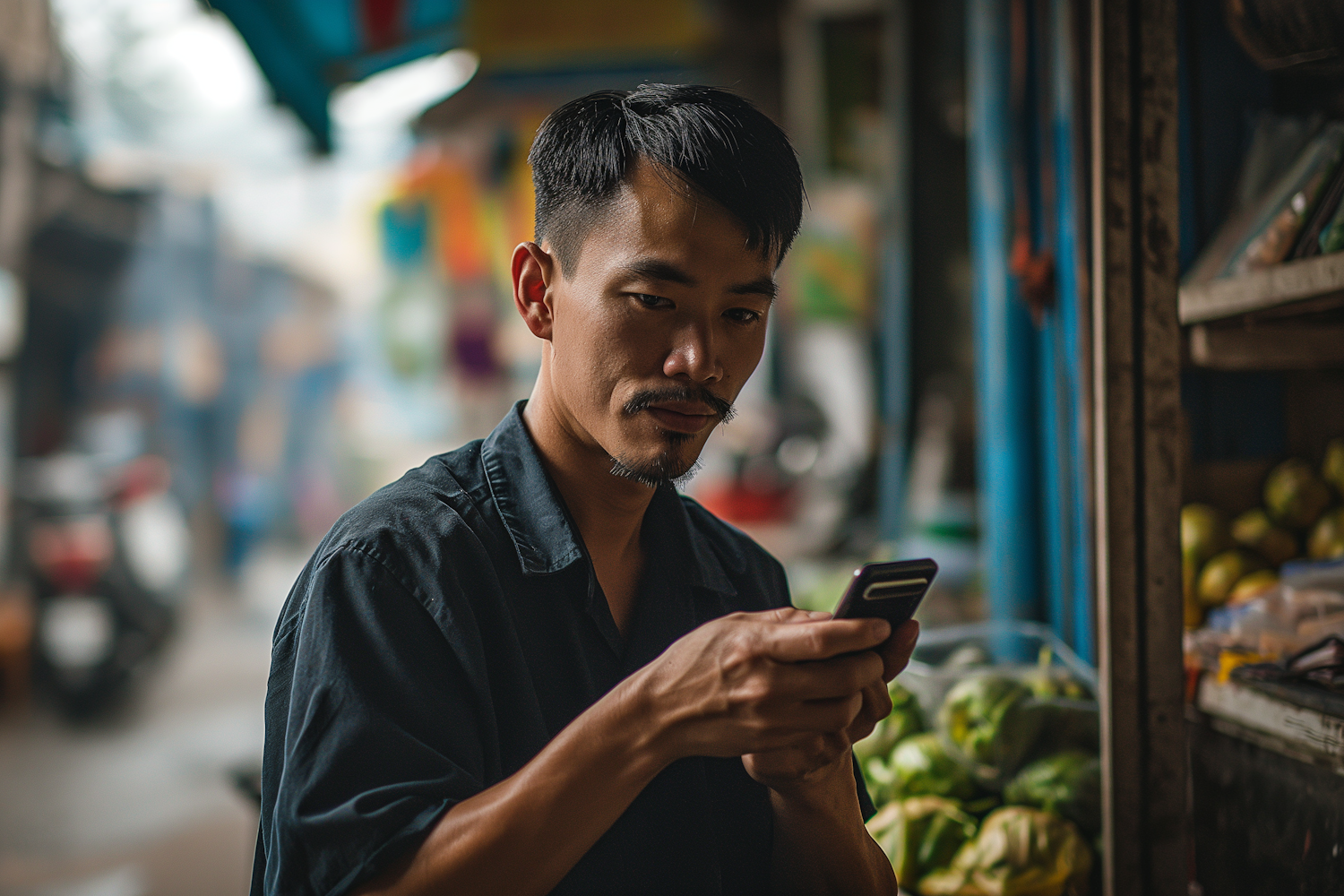 Asian man in a market using a smartphone, surrounded by fresh produce. Focused expression, blending modern tech with traditional setting.