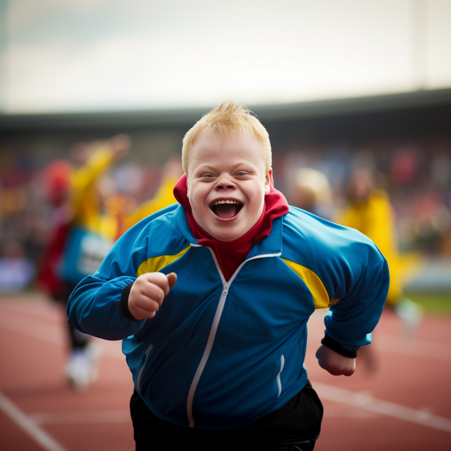 Joyful boy with Down syndrome running on a track, wearing a blue and yellow jacket. His smile radiates happiness and excitement.