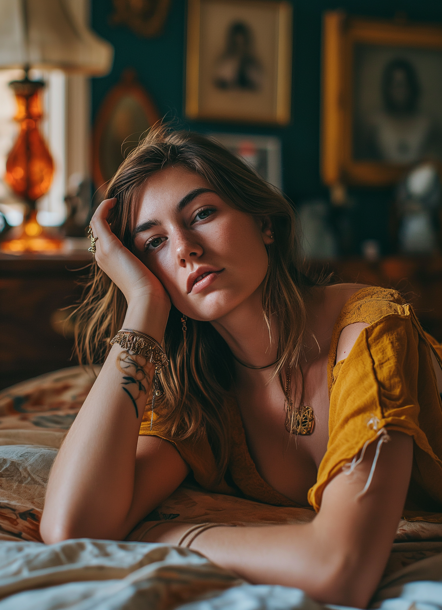 Young woman in a mustard yellow top, lying on a bed with a relaxed expression, surrounded by warm, artistic decor.