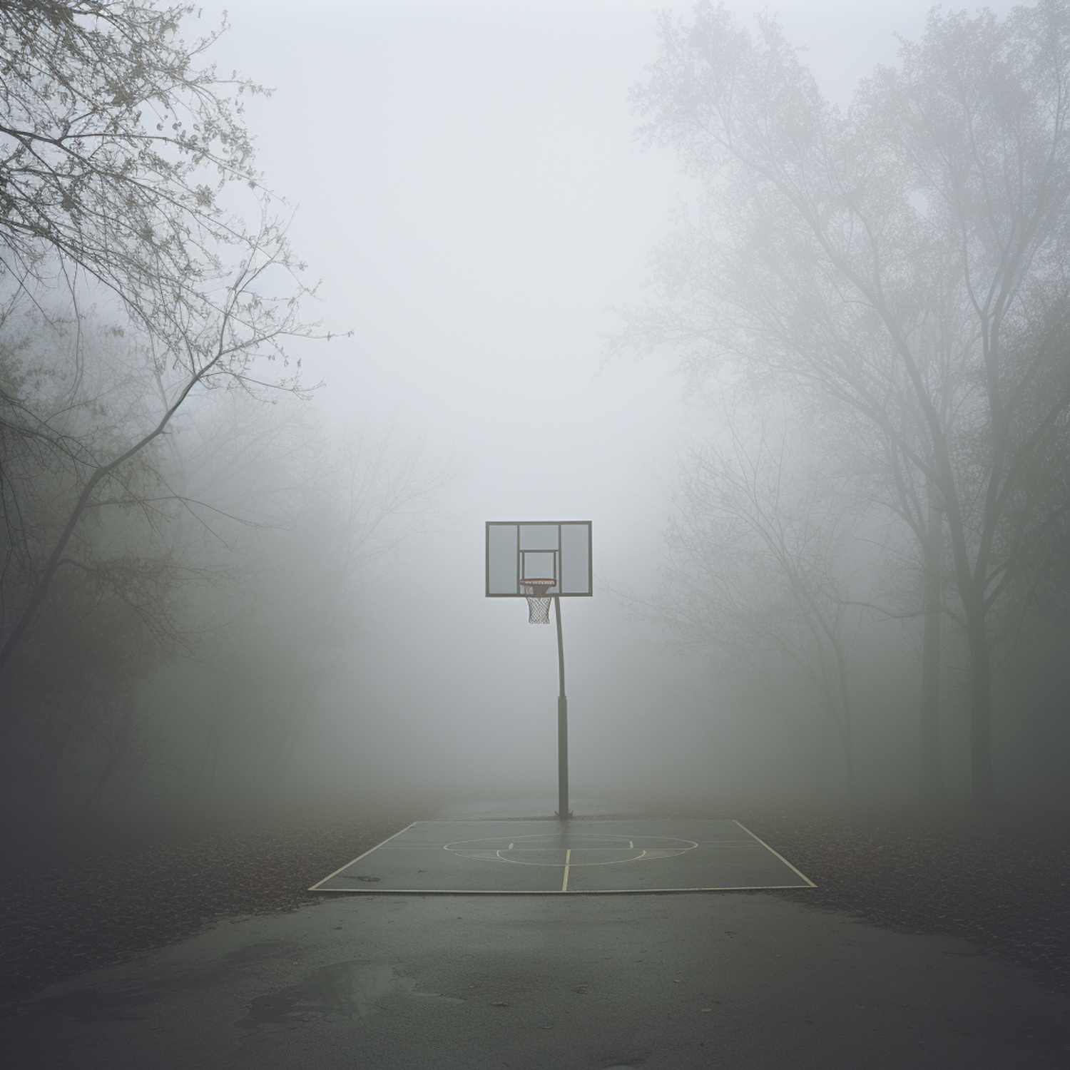 A foggy basketball court with a solitary hoop, surrounded by bare trees and wet ground, creating an eerie and isolated atmosphere.