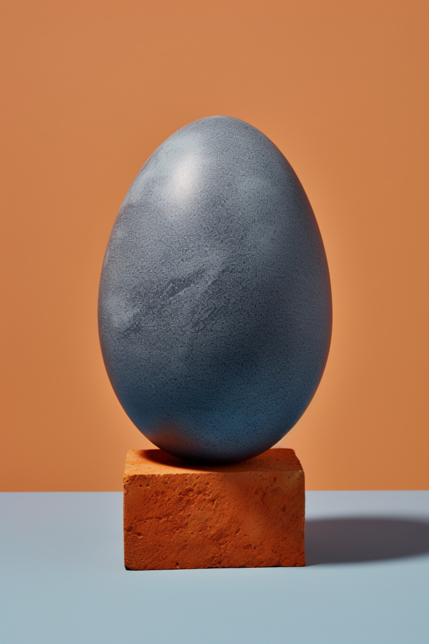 A metallic blue egg on an orange brick with a bold orange background and muted blue surface, creating a striking color contrast.