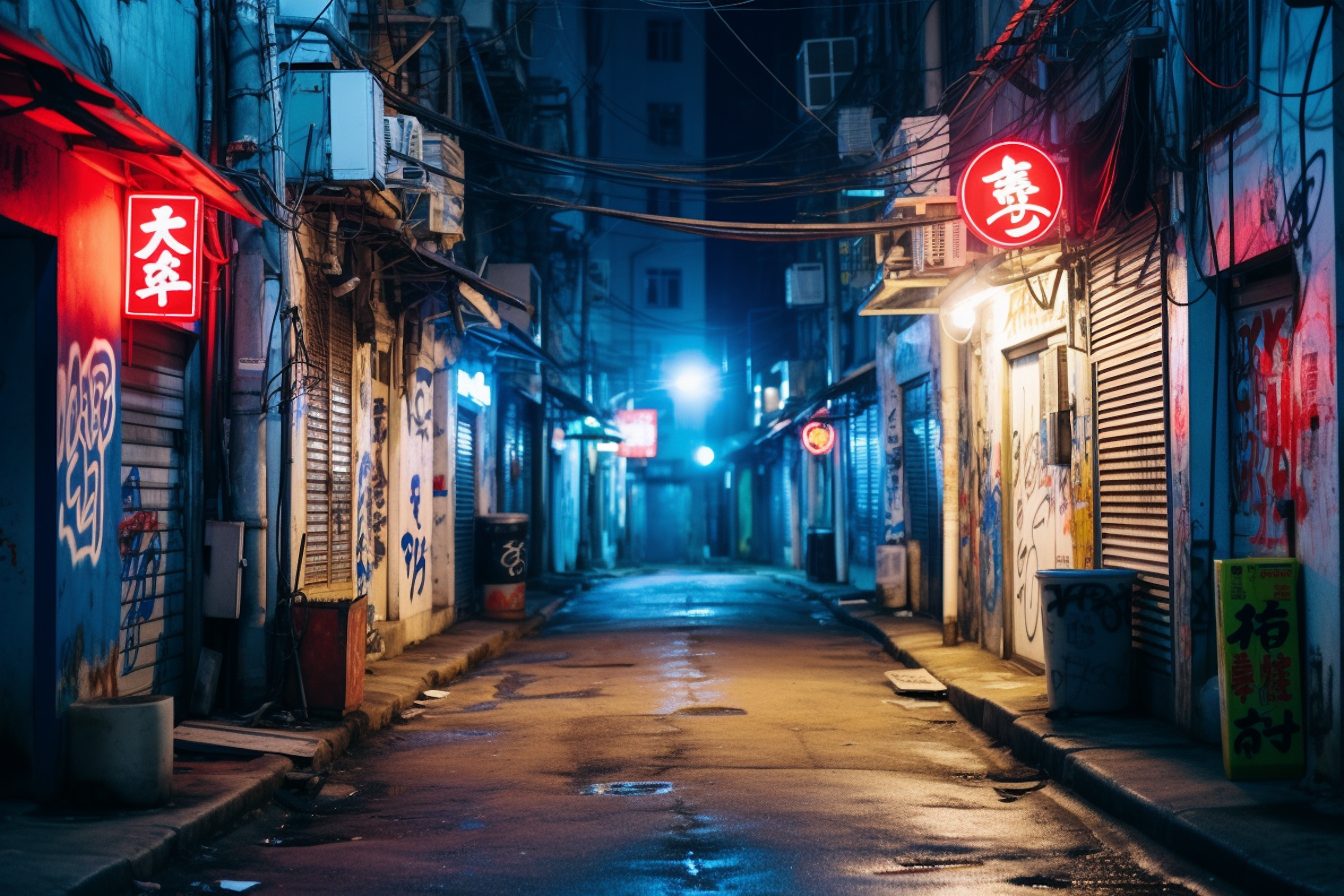 Moody urban alley at night with neon signs, wet pavement, and graffiti-covered walls, creating a gritty, atmospheric scene.