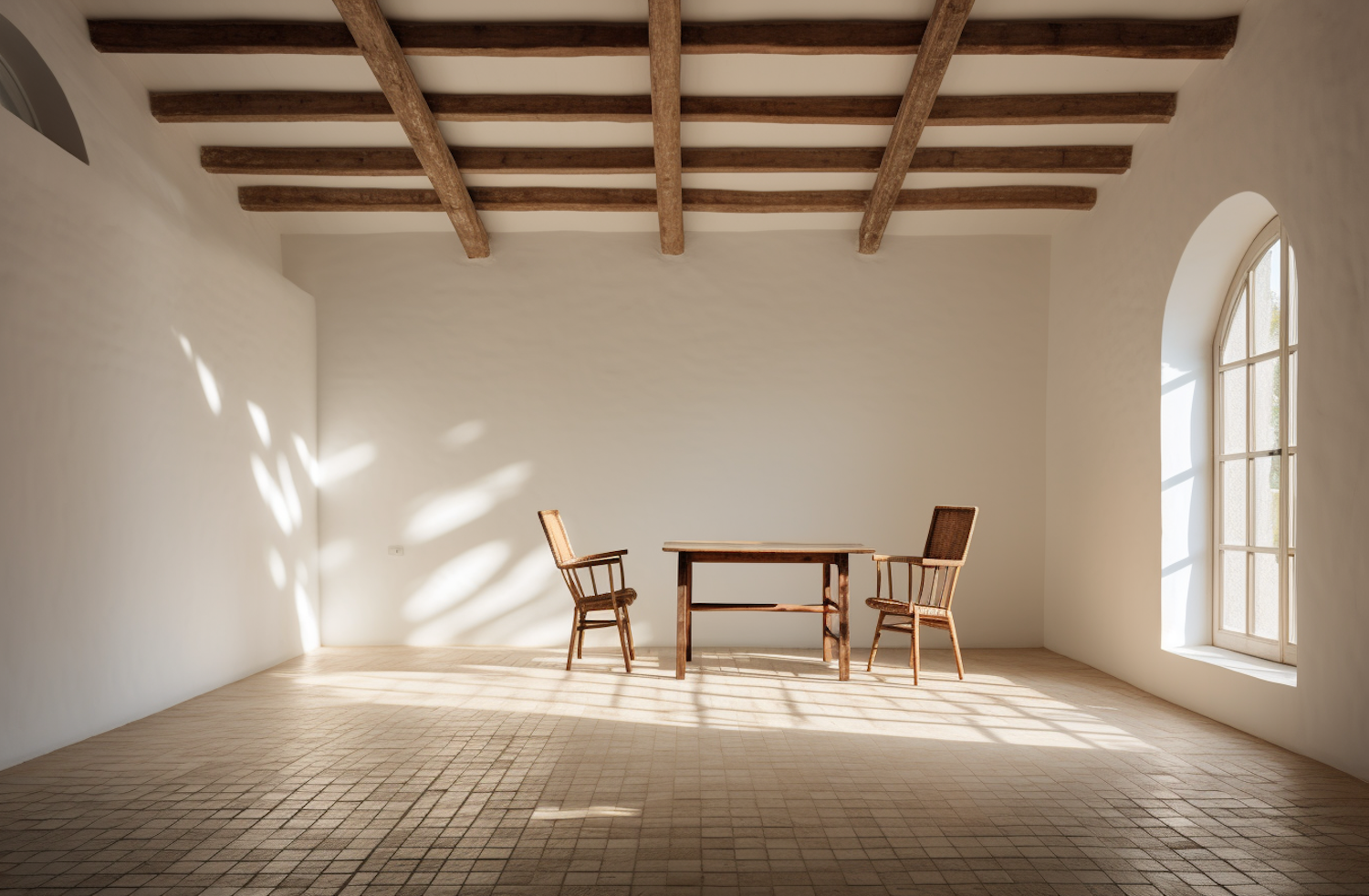 Minimalist room with wooden furniture, arched window, and sunlight casting shadows on tiled floor. Rustic beams add charm.