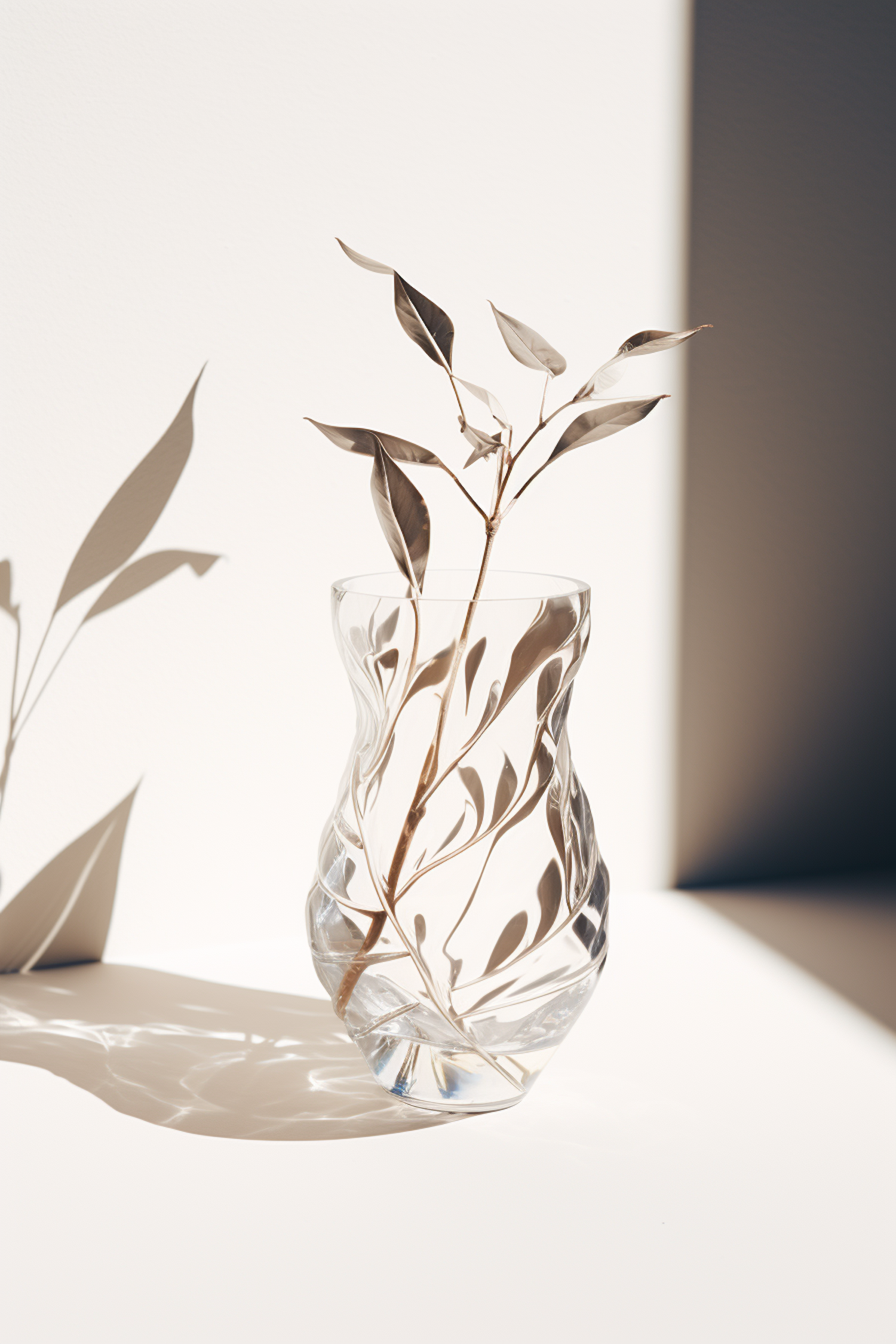 Elegant glass vase with a branch casting intricate shadows on a minimalist background, creating a serene and artistic composition.