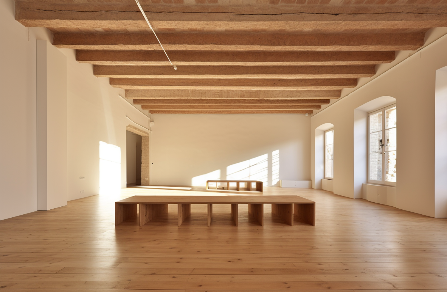 Spacious minimalist room with wooden floors, exposed beams, and large windows. Natural light creates a warm, inviting atmosphere.