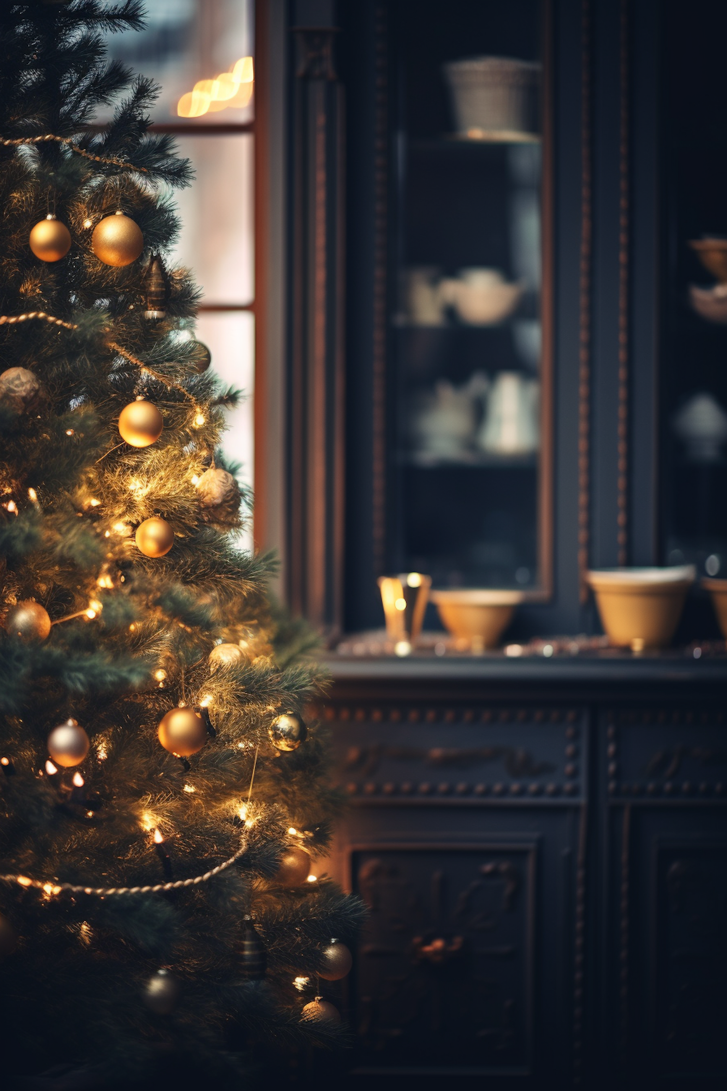 Elegant Christmas tree with golden baubles and lights beside a dark wooden cabinet, creating a cozy holiday atmosphere.