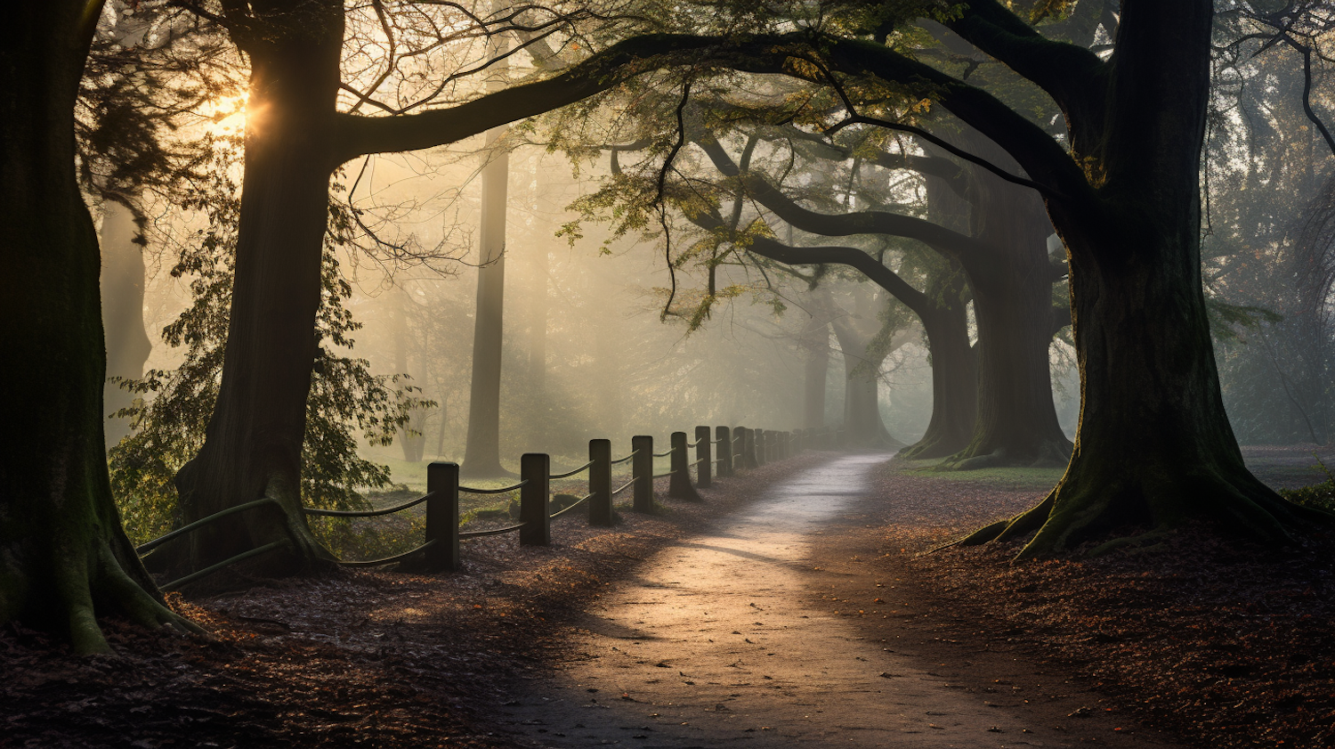 Enchanting forest path with sunlit trees and misty atmosphere, creating a serene and mystical ambiance.