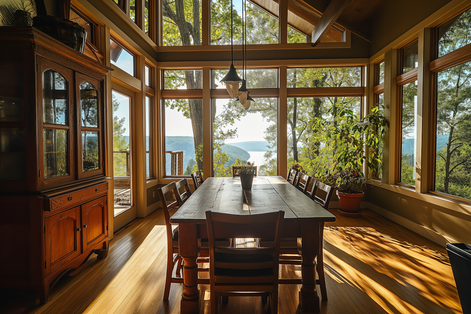 Sunlit dining room with panoramic views, wooden furniture, and lush greenery outside. Warm, inviting atmosphere with natural light.
