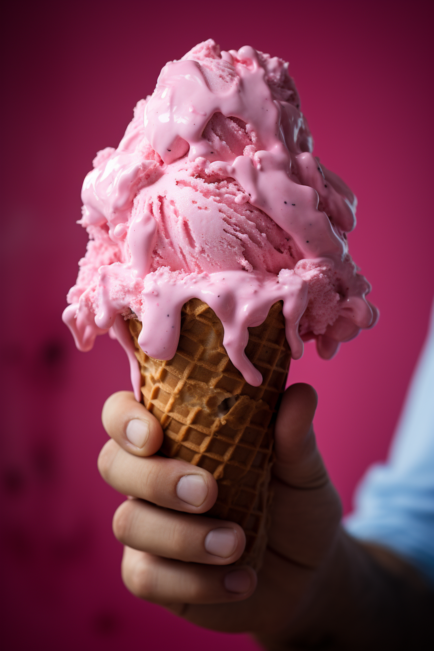 Delicious pink ice cream melting over a waffle cone, held against a vibrant pink background. Perfect for dessert lovers!