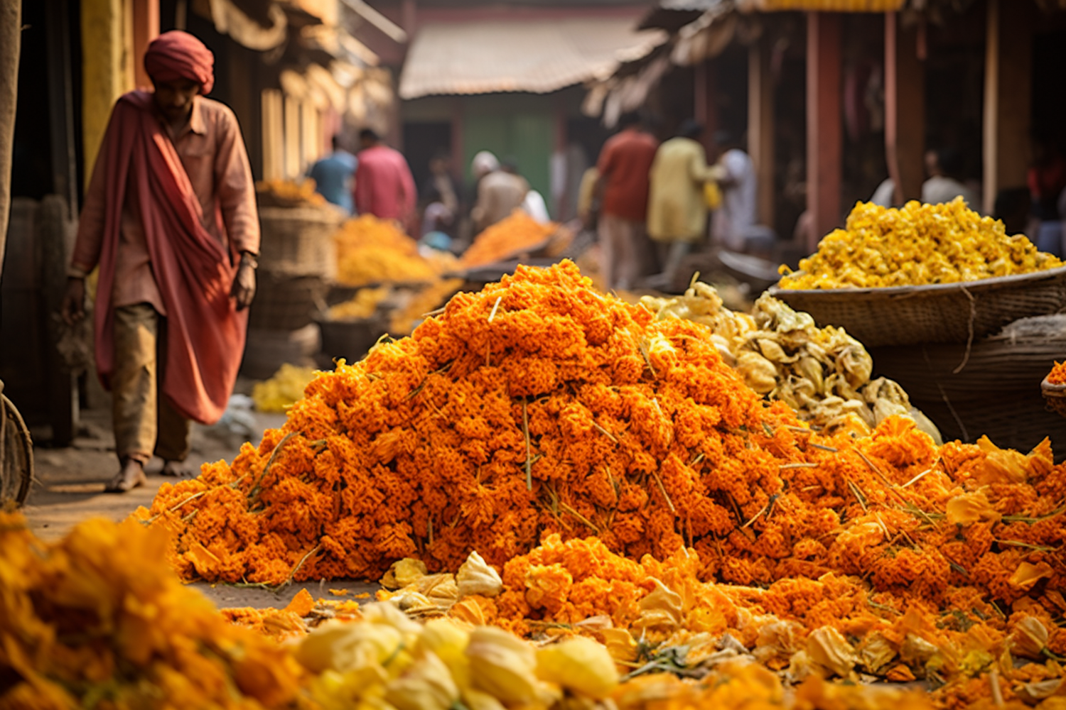 Vibrant market scene with piles of orange and yellow marigold flowers, a man in traditional attire, and bustling background activity.