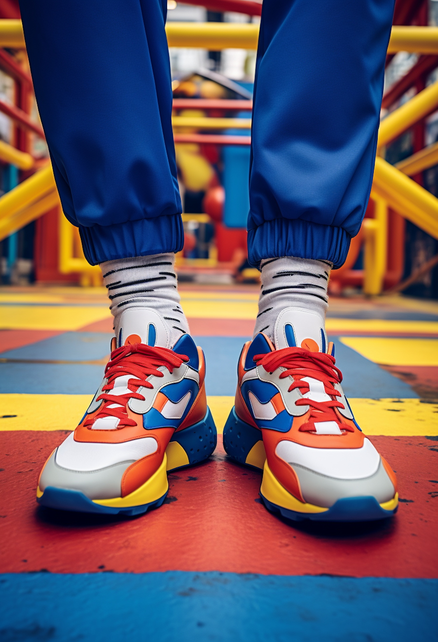 Bold sneakers with orange, blue, and yellow accents paired with striped socks in a vibrant, playful setting. Perfect for sporty vibes.