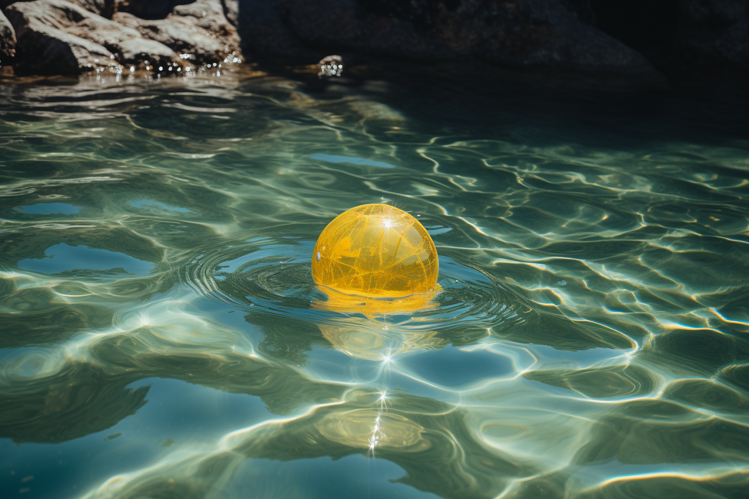 Yellow inflatable ball floating on clear turquoise water with sunlit reflections and ripples, creating a serene summer vibe.