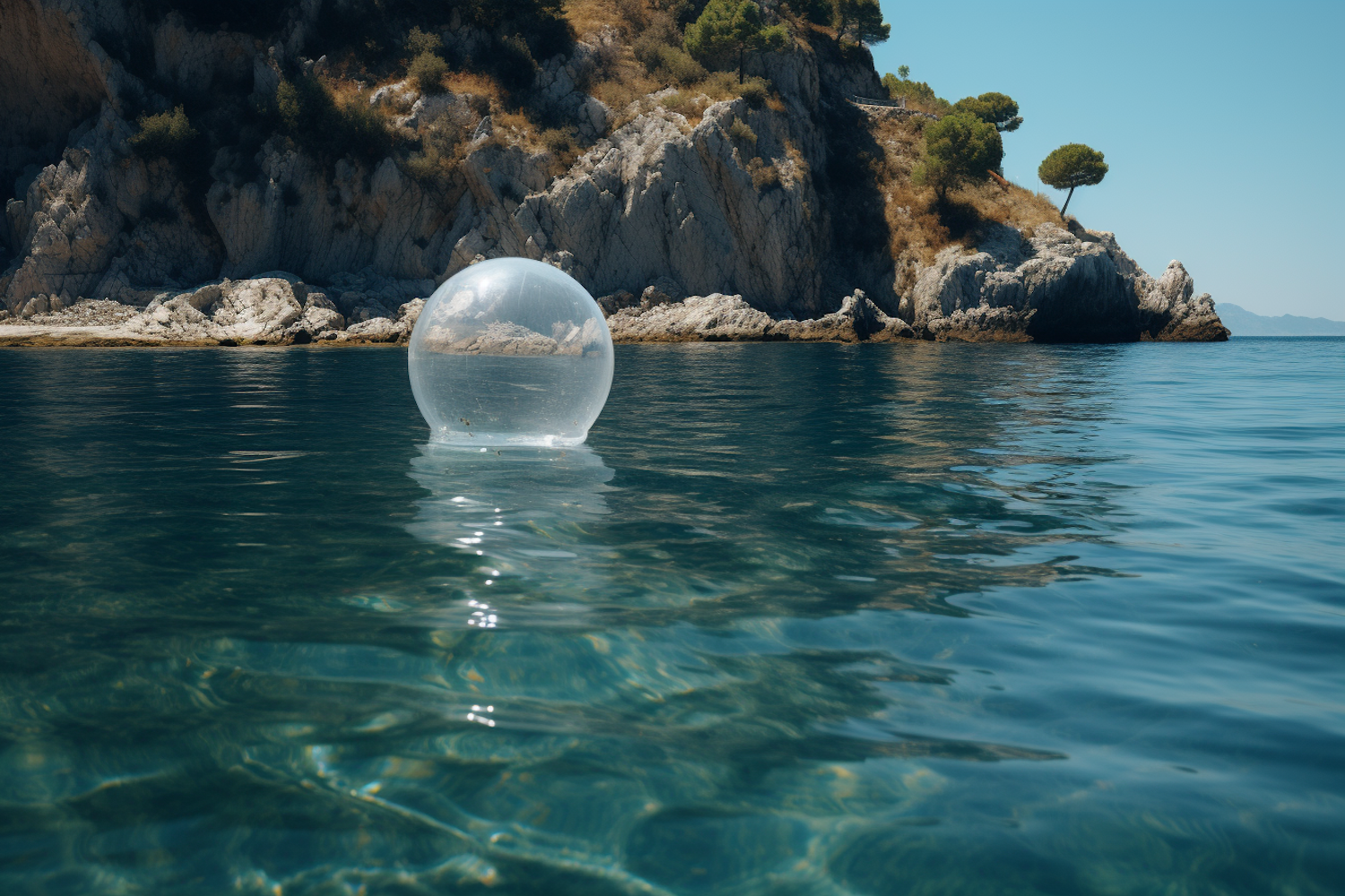 A transparent sphere floats on a calm sea with a rocky cliff and clear blue sky in the background, creating a serene scene.