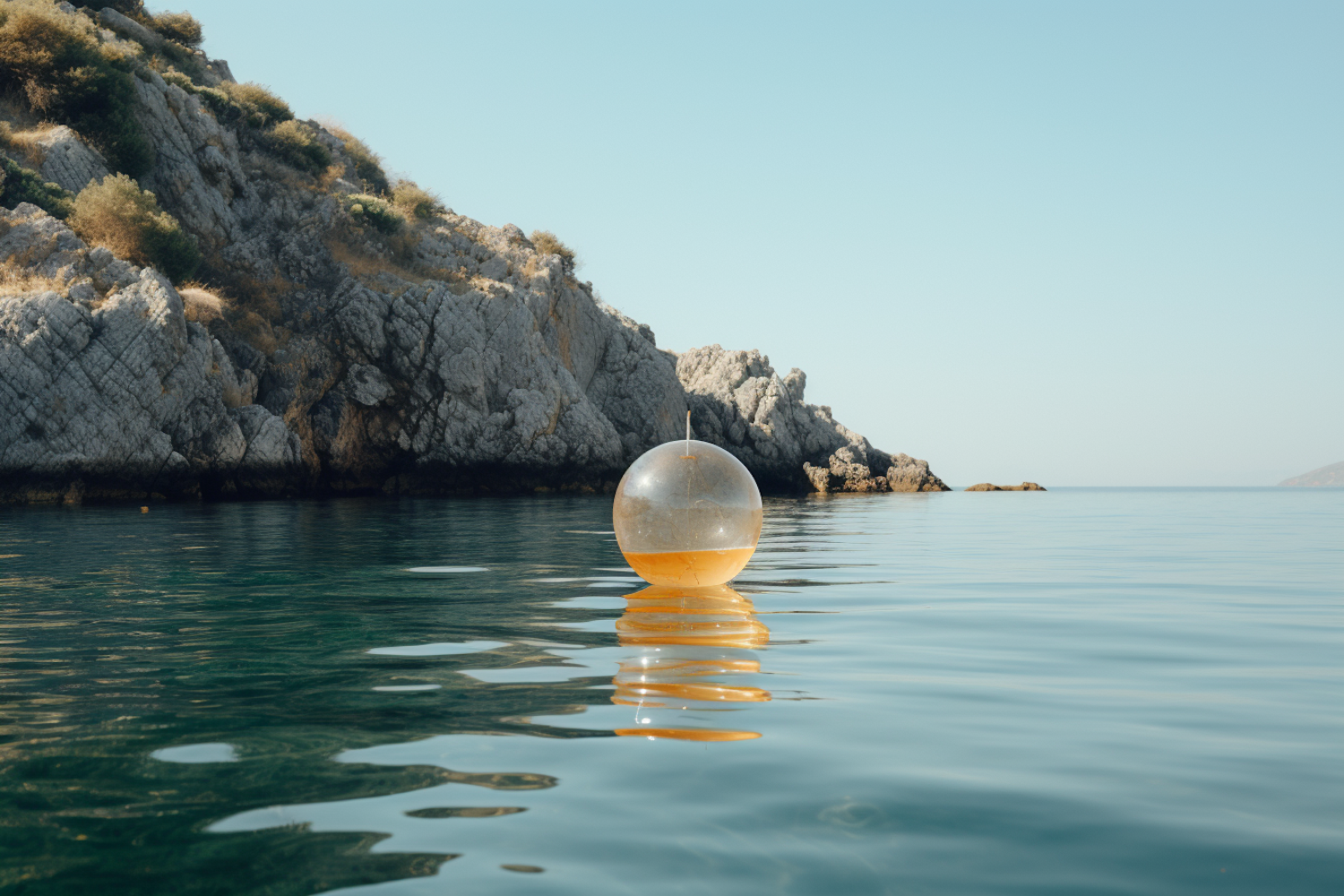 Serene seascape with a transparent buoy floating on calm waters, set against a rugged rocky coastline under a clear blue sky.