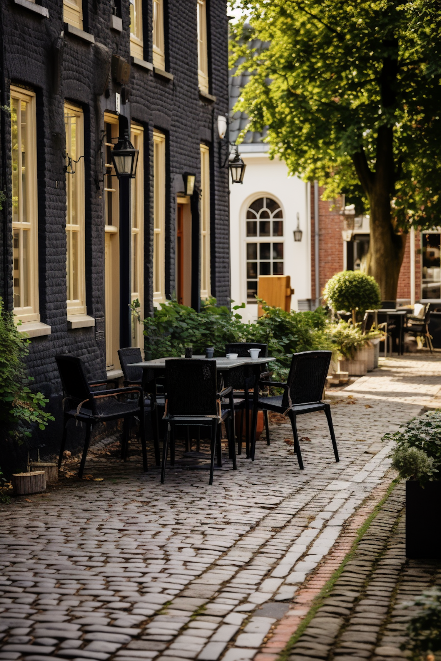 Charming cobblestone alley with black brick buildings, outdoor café seating, and lush greenery under warm sunlight.