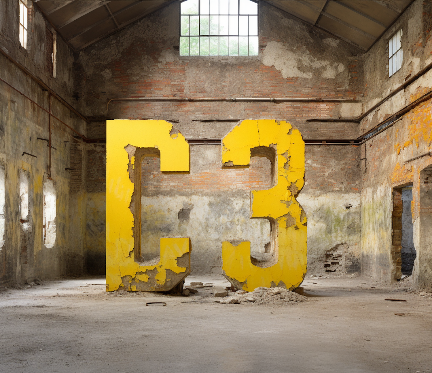 Large yellow "C3" letters in a decaying industrial warehouse, contrasting against exposed brick and concrete walls.