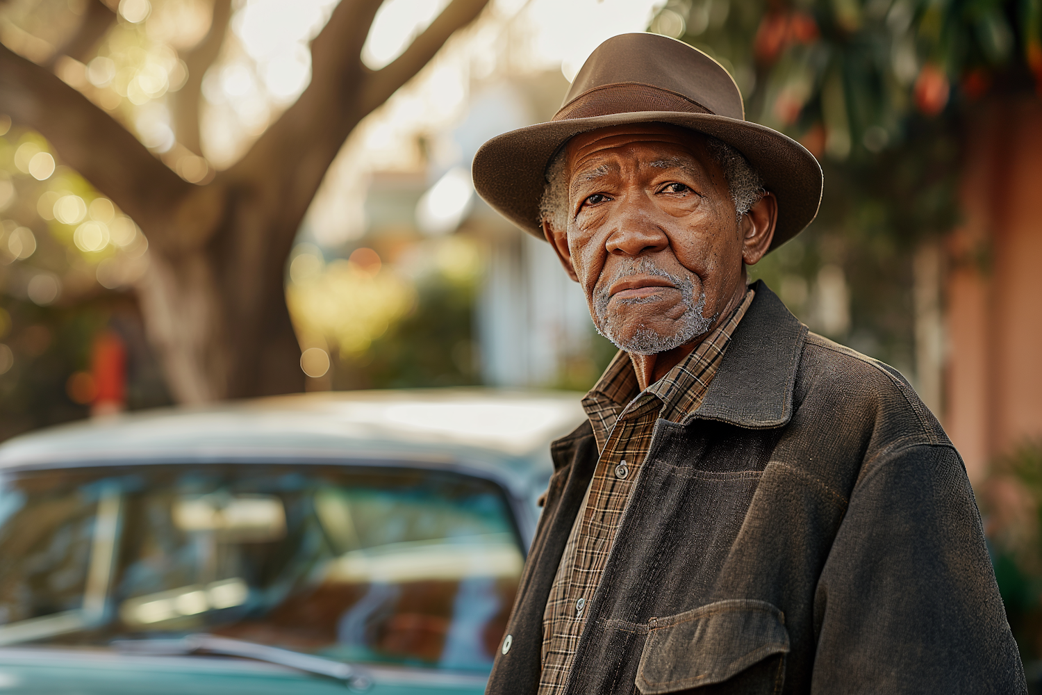 Elderly man in a brown hat and jacket stands by a vintage car, with a thoughtful expression in a warm, natural setting.