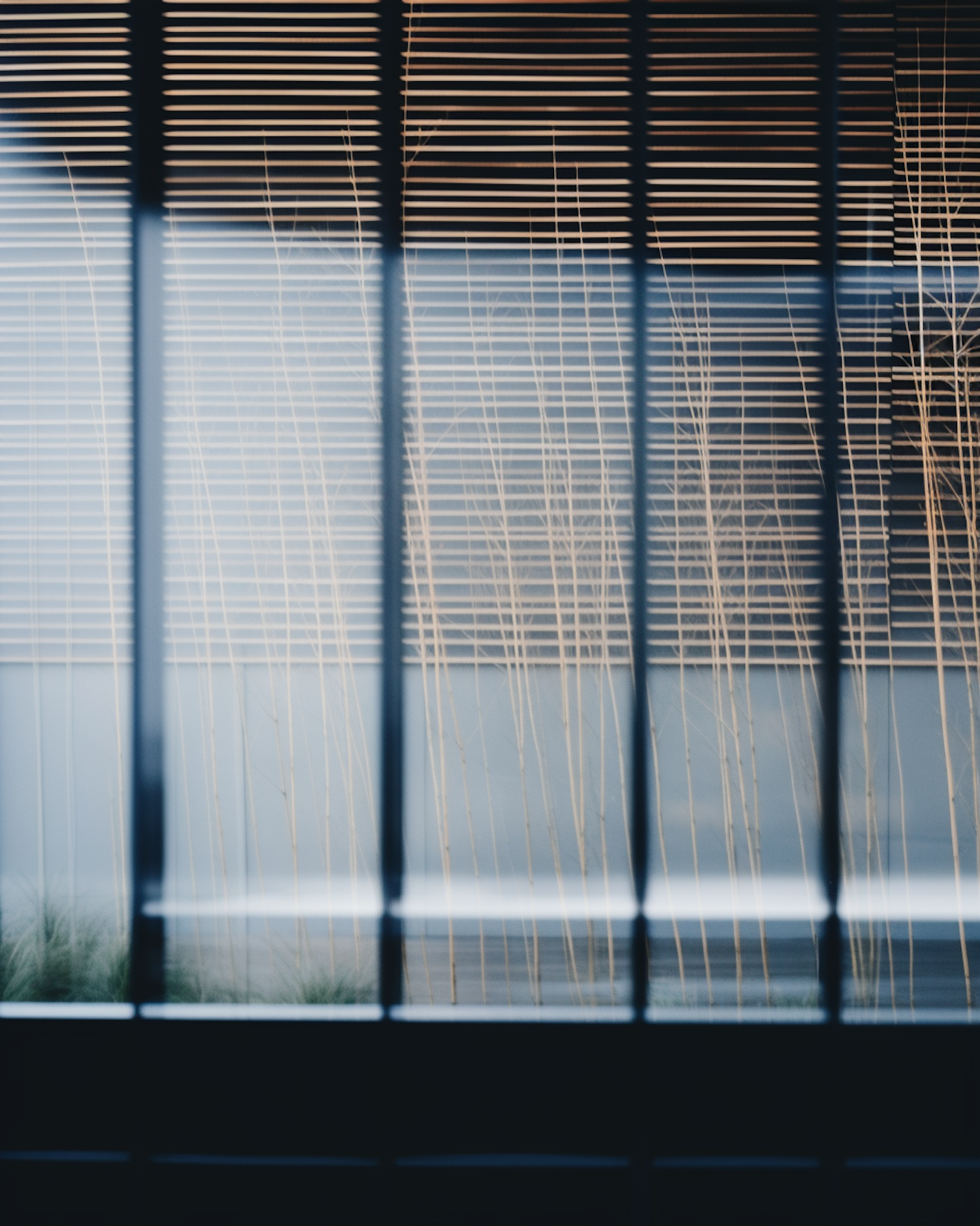 Abstract view of bamboo stalks behind horizontal blinds, creating a serene interplay of lines and light with a muted color palette.