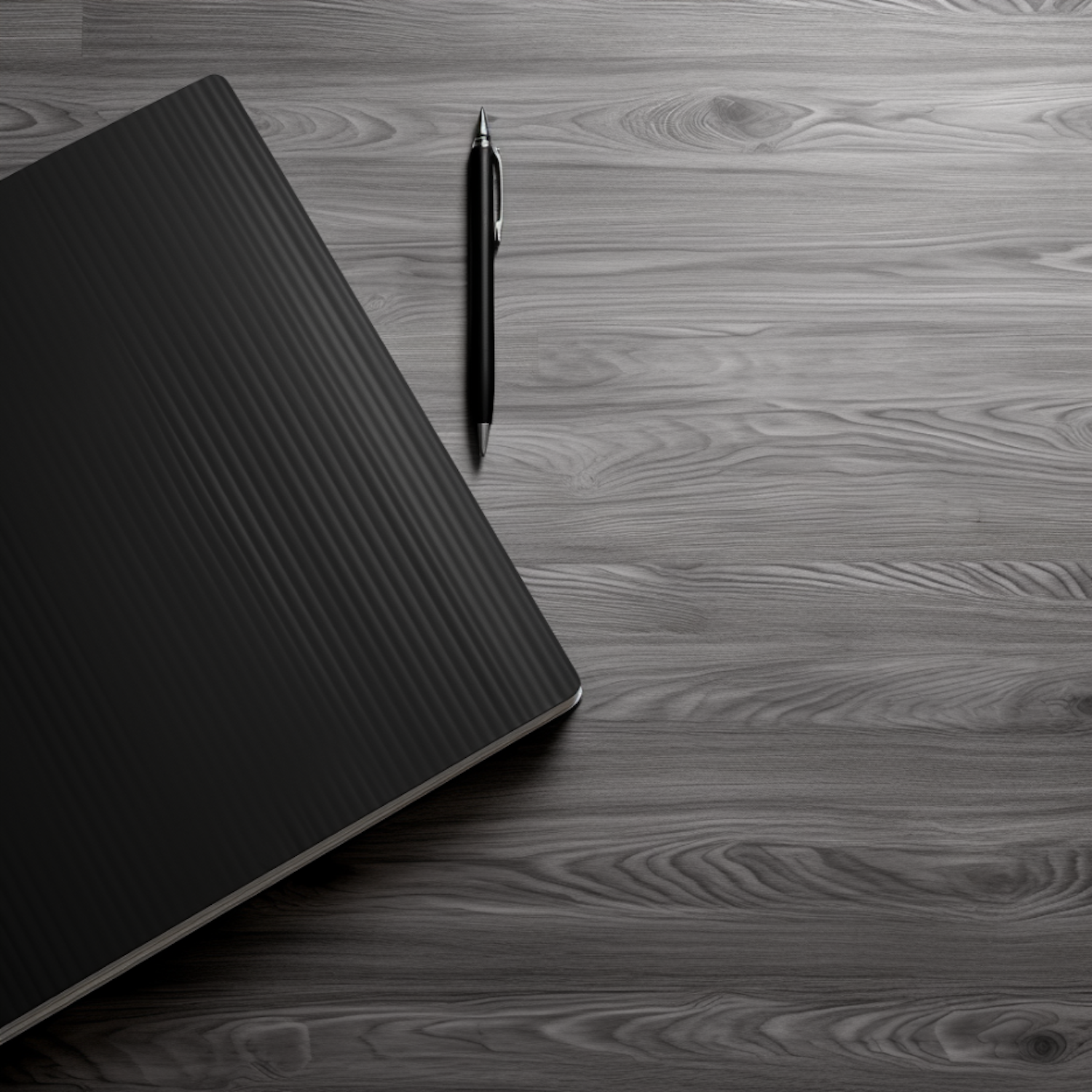 Minimalist scene with a black notebook and pen on a light gray wooden surface, highlighting textures and contrasts.