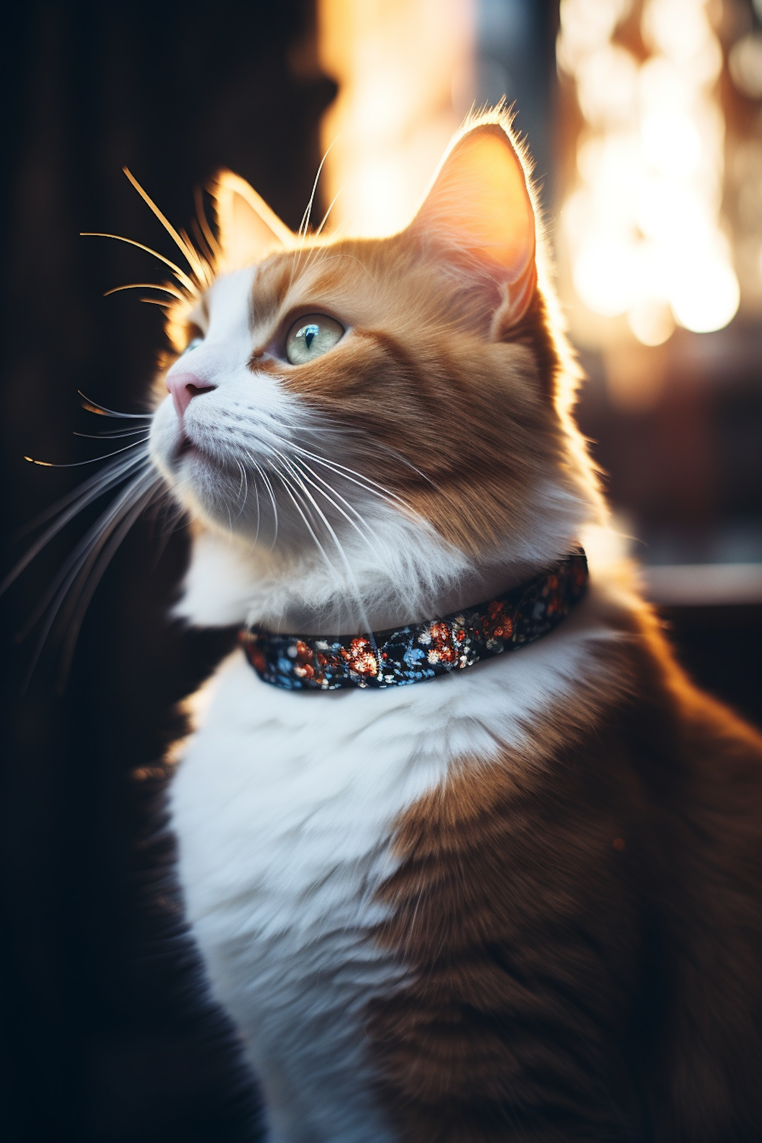Fluffy orange and white cat with green eyes and floral collar, basking in warm sunlight. Serene and cozy atmosphere.