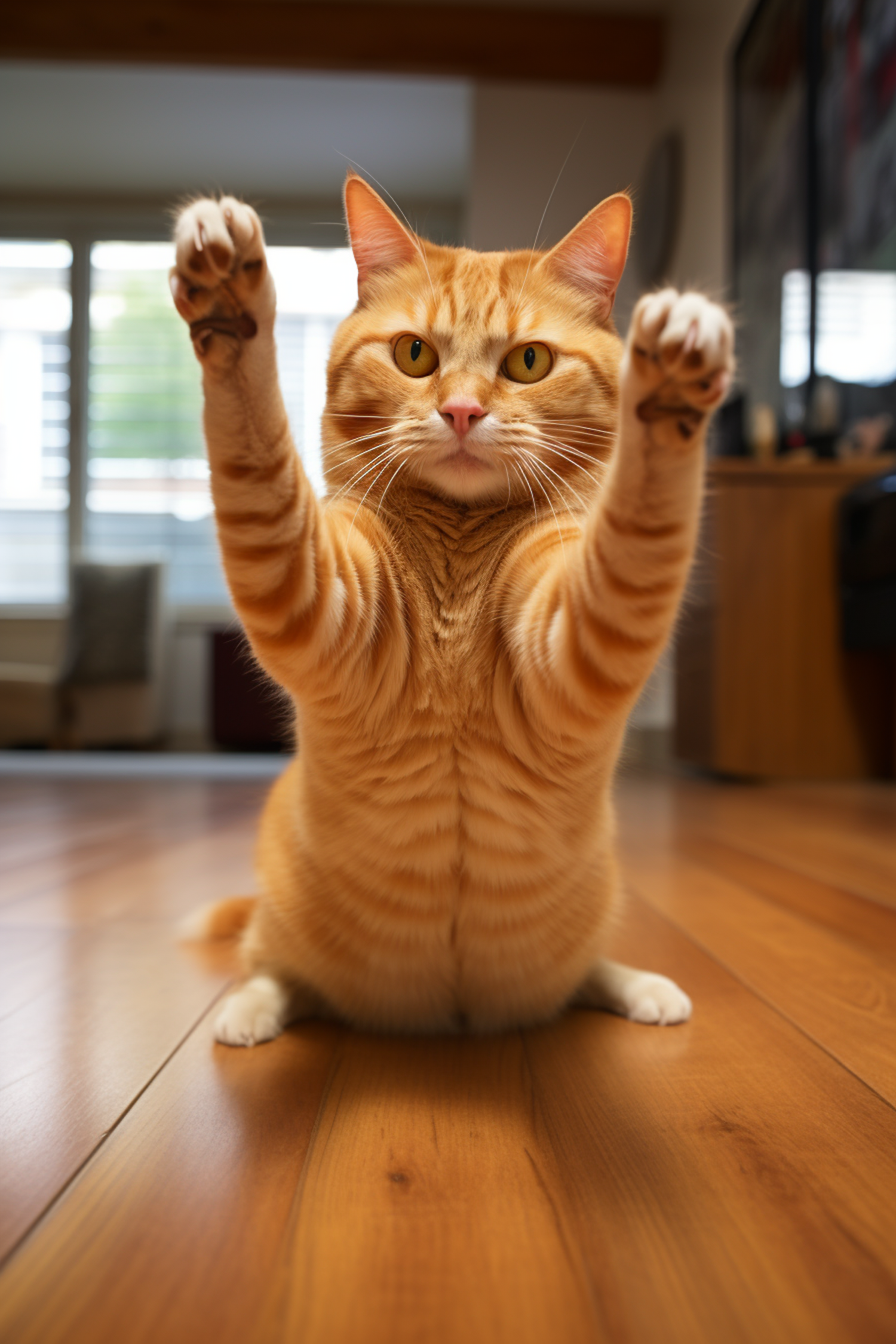 Adorable orange tabby cat sitting upright with paws raised on a wooden floor in a cozy indoor setting. Bright and playful vibe.