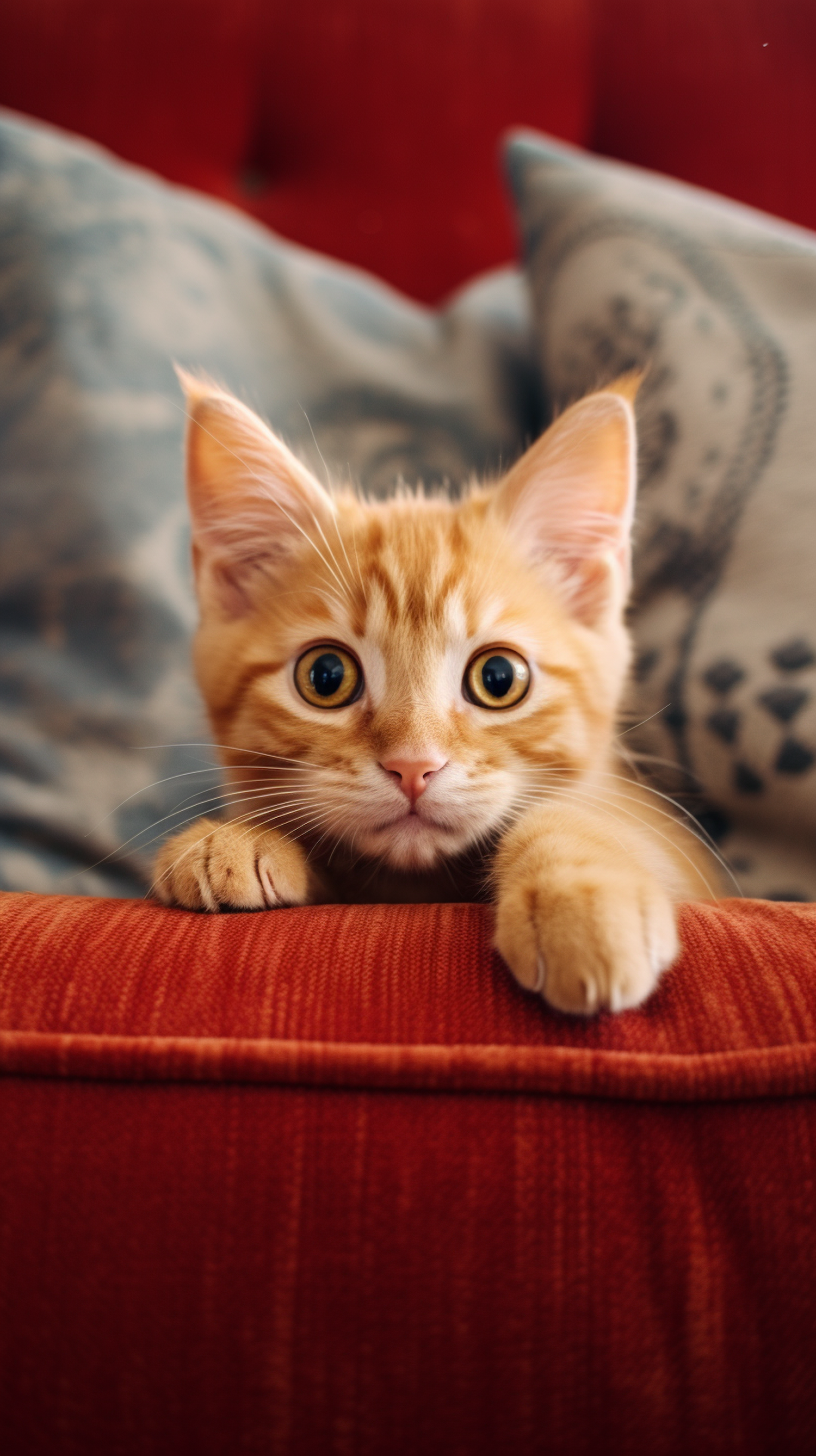 Adorable ginger kitten peeking over a red sofa with wide eyes, surrounded by cozy pillows. Perfect for cat lovers!