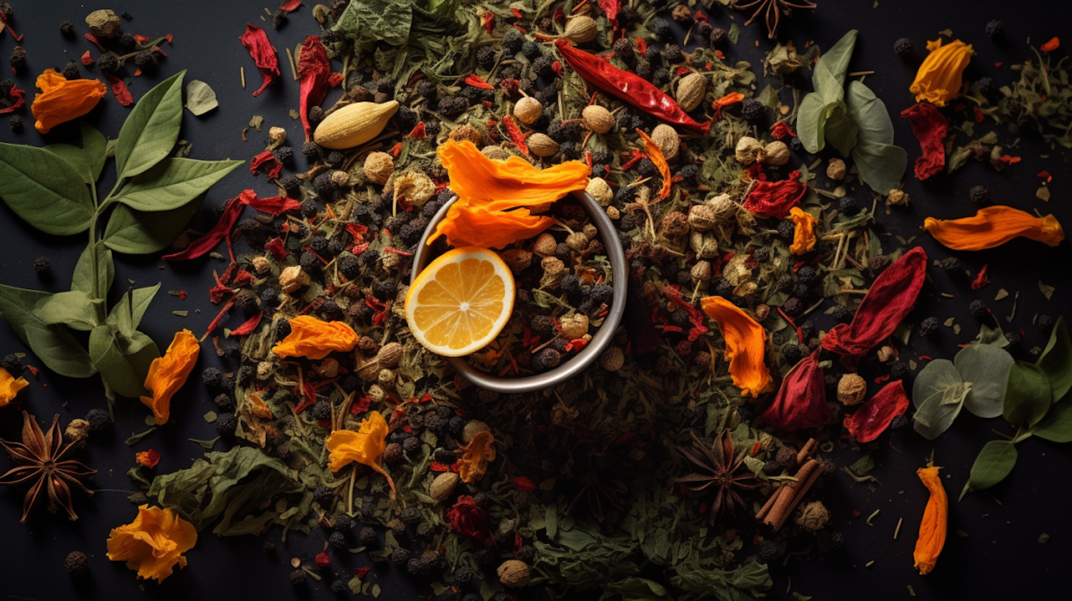 Colorful spices and herbs with a halved lemon on a dark surface, featuring dried flowers, peppercorns, and star anise.