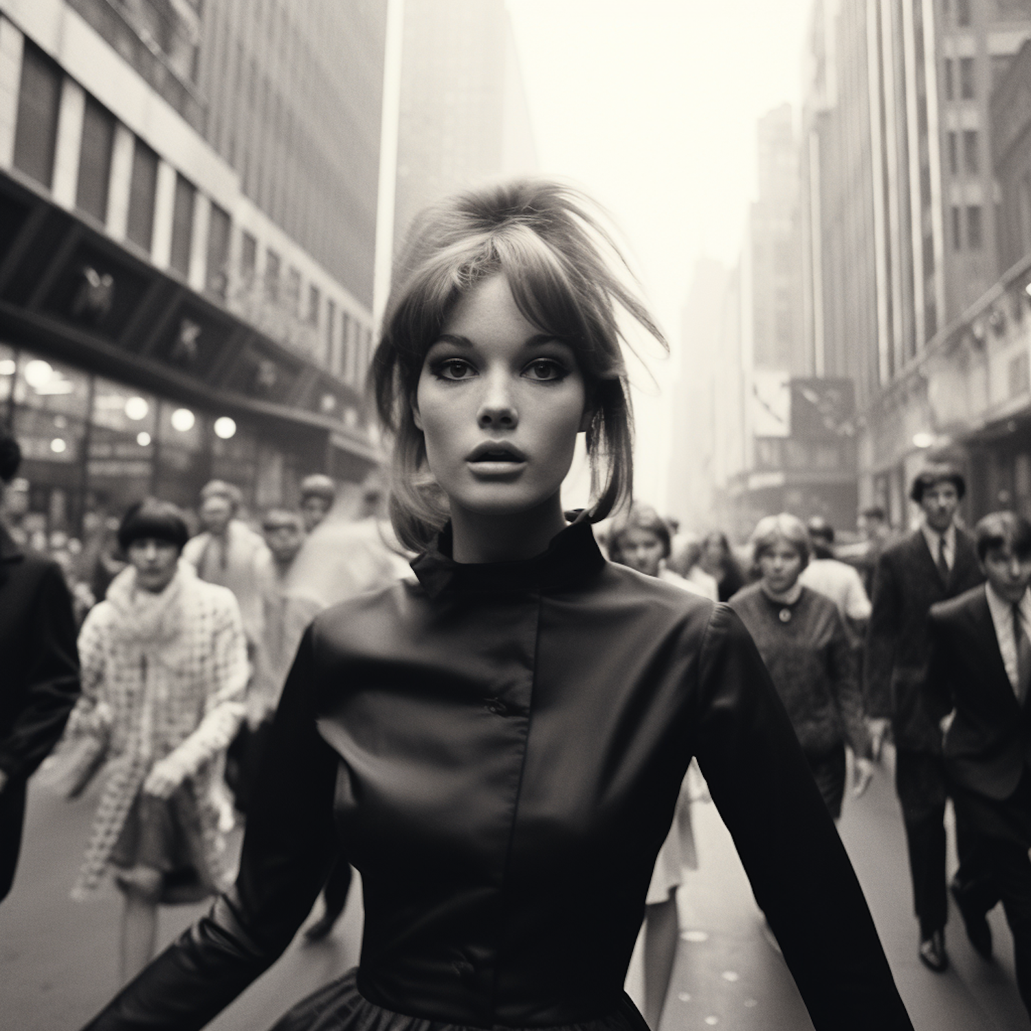 A striking black and white photo of a woman in 1960s fashion amidst a bustling city street crowd.