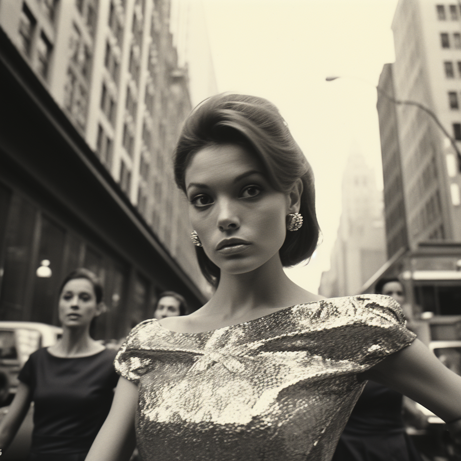 Elegant woman in a sequined dress in a vintage cityscape, exuding mid-20th-century glamour and sophistication.