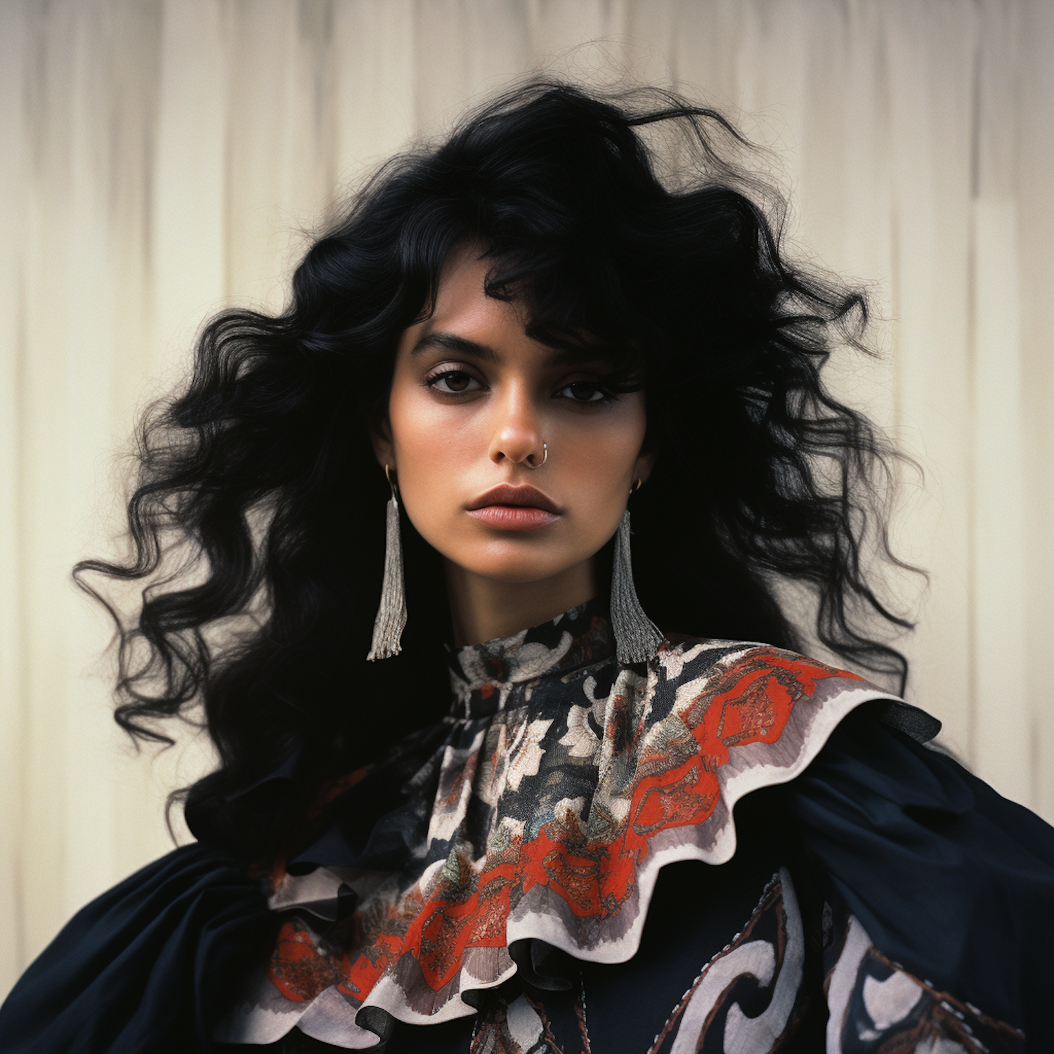Elegant woman with wavy black hair, ornate outfit, and tassel earrings against a neutral background. Striking and sophisticated look.