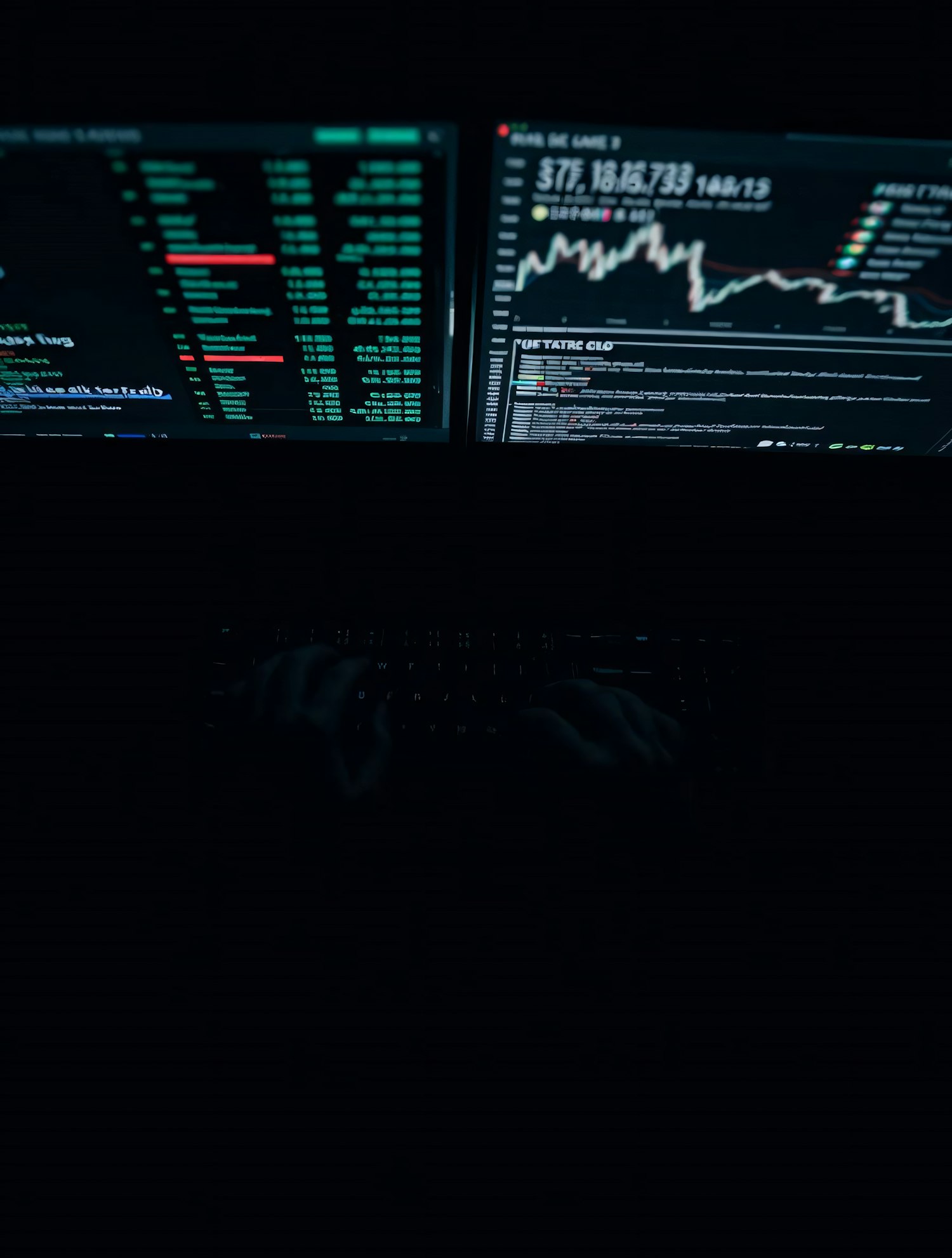 A dark workspace with monitors displaying financial data and charts, with hands typing on a keyboard below, creating a tech-focused vibe.