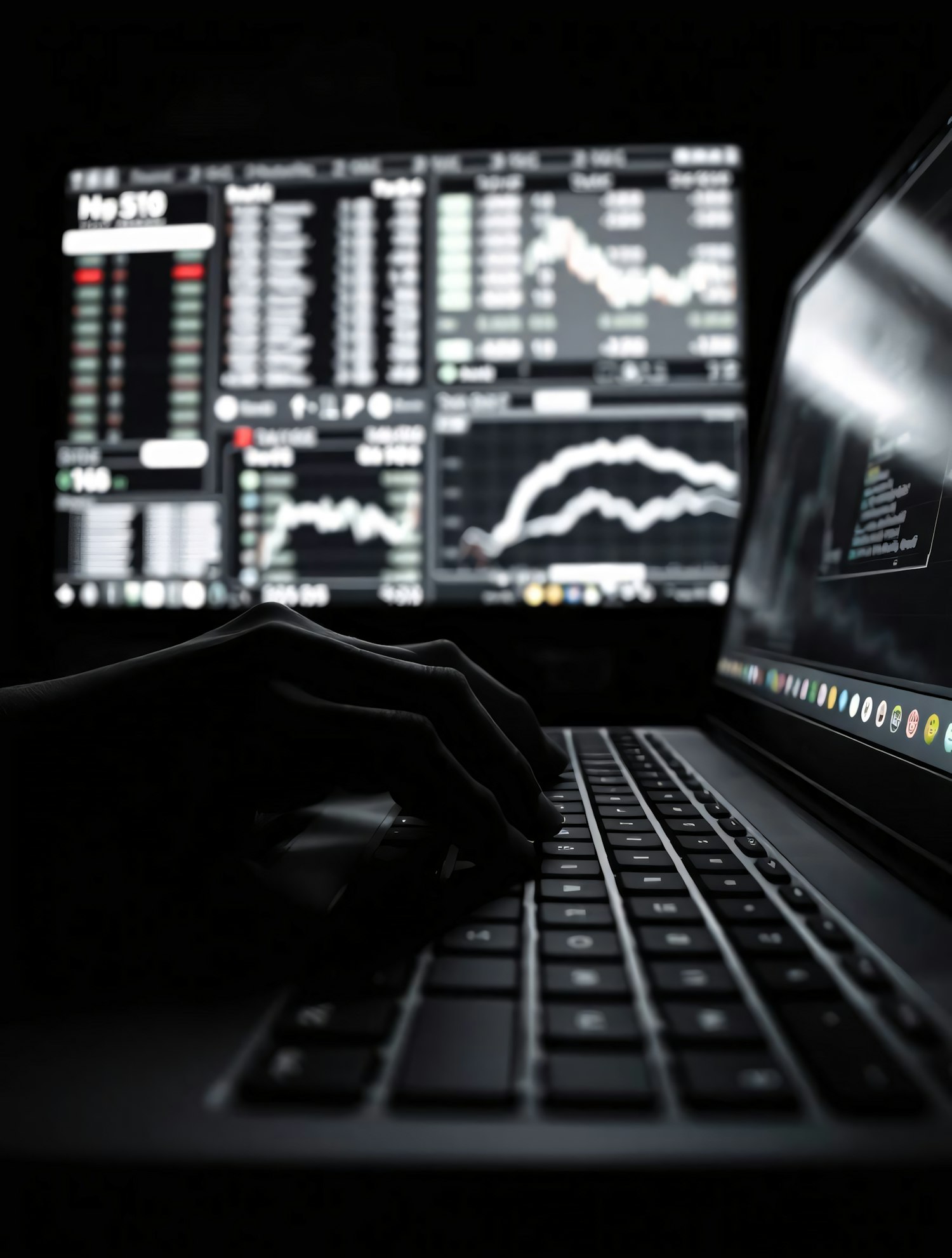 A person types on a laptop in a dark room, with financial charts and data displayed on a monitor in the background.