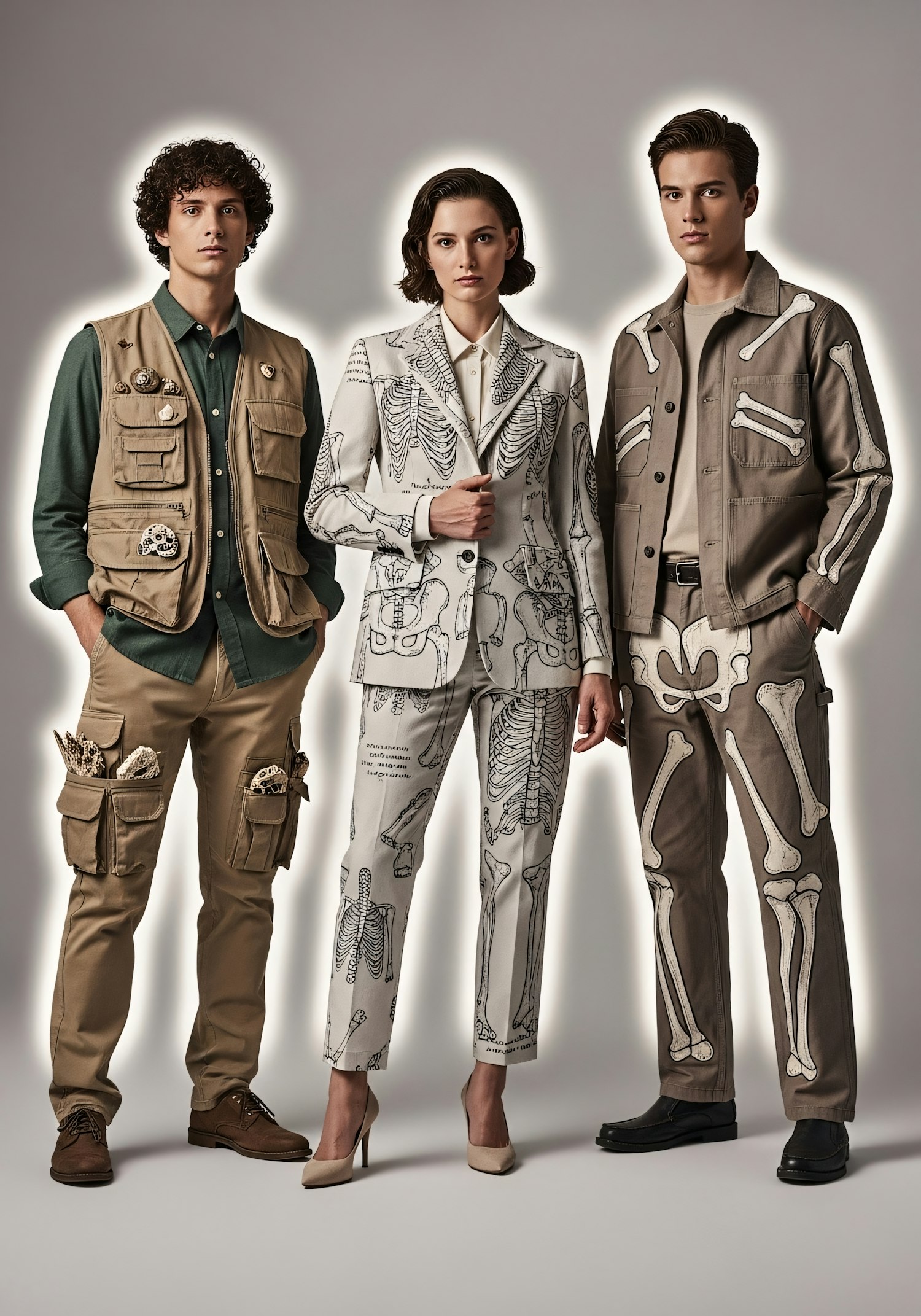 Three individuals in unique outfits featuring anatomical and naturalistic designs, standing against a neutral background.