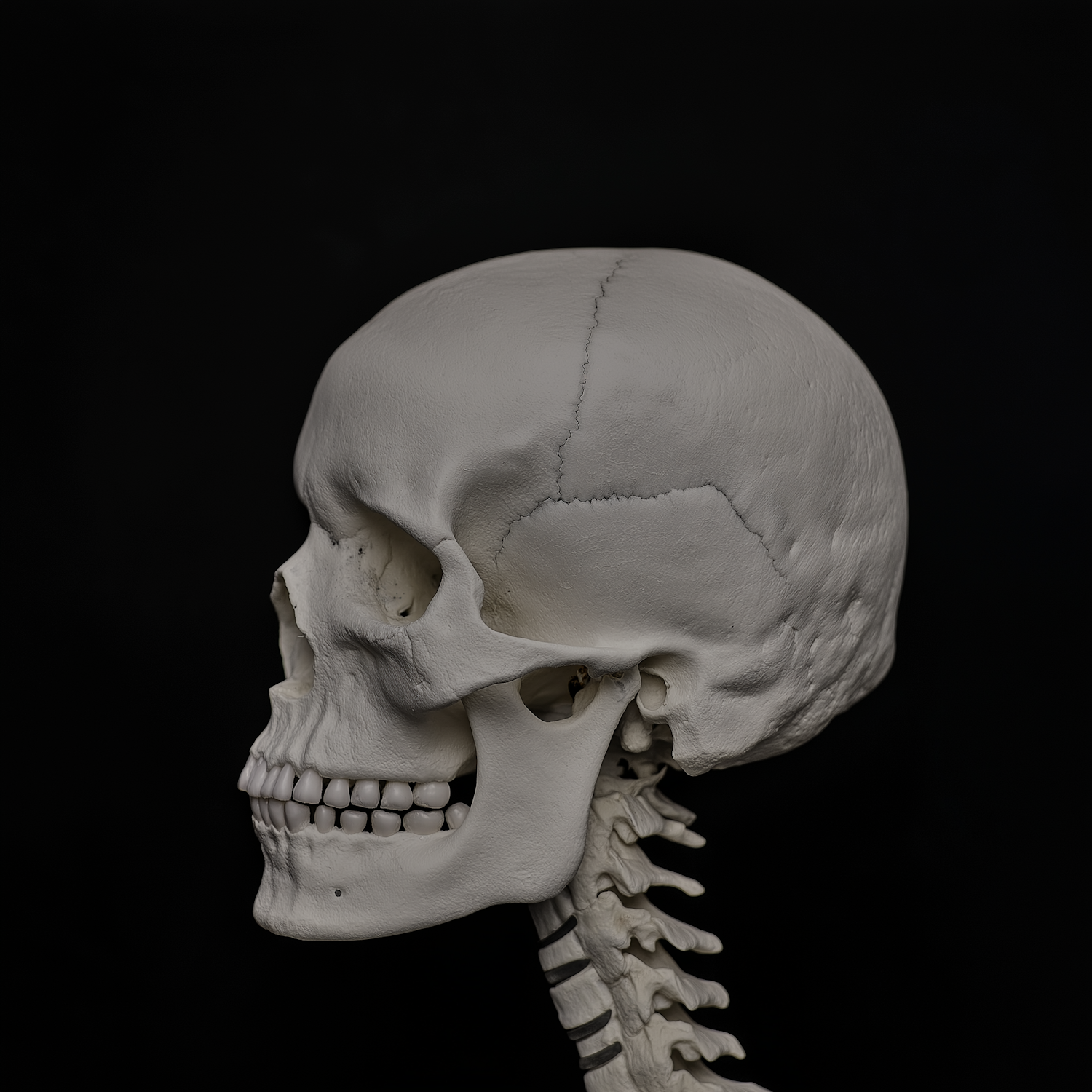 Side view of a detailed human skull model with visible cranial sutures and teeth, set against a black background for contrast.