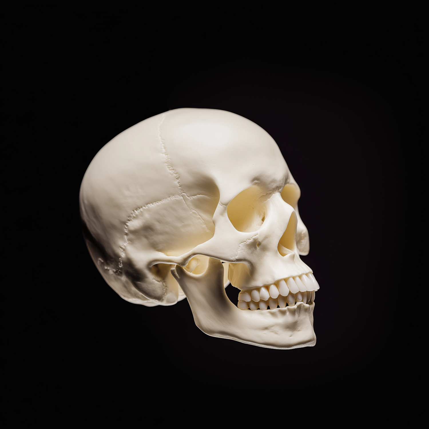 Side view of a human skull on a dark background, showcasing detailed anatomy and bone structure with a focus on texture and sutures.